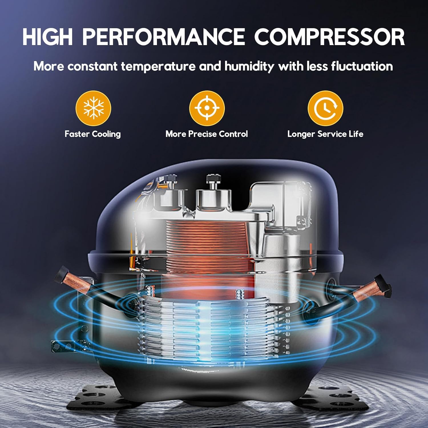 - ăSilent Compressor Cooling& 546 Cigar CapacityăUsing silent compressor refrigeration technology, compared with semiconductor refrigeration, the compressor service life is increased by 30%, refrigeration speed is increased by 40%, temperature and humidity fluctuation â€1, noise †35dB, no vibration, so you can enjoy life without worry. Front air outlet and 4 adjustable non-slip feet, which can be built-in or under-counter. The electric humidors for cigars have a capacity of up to 88L and can hold up to 546 cigars (depending on ring gauge). It is equipped with a safety lock to ensure the security of your precious collection.