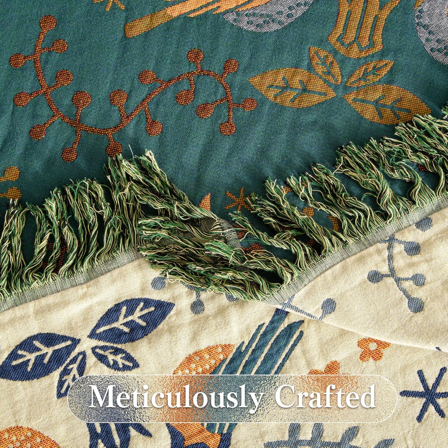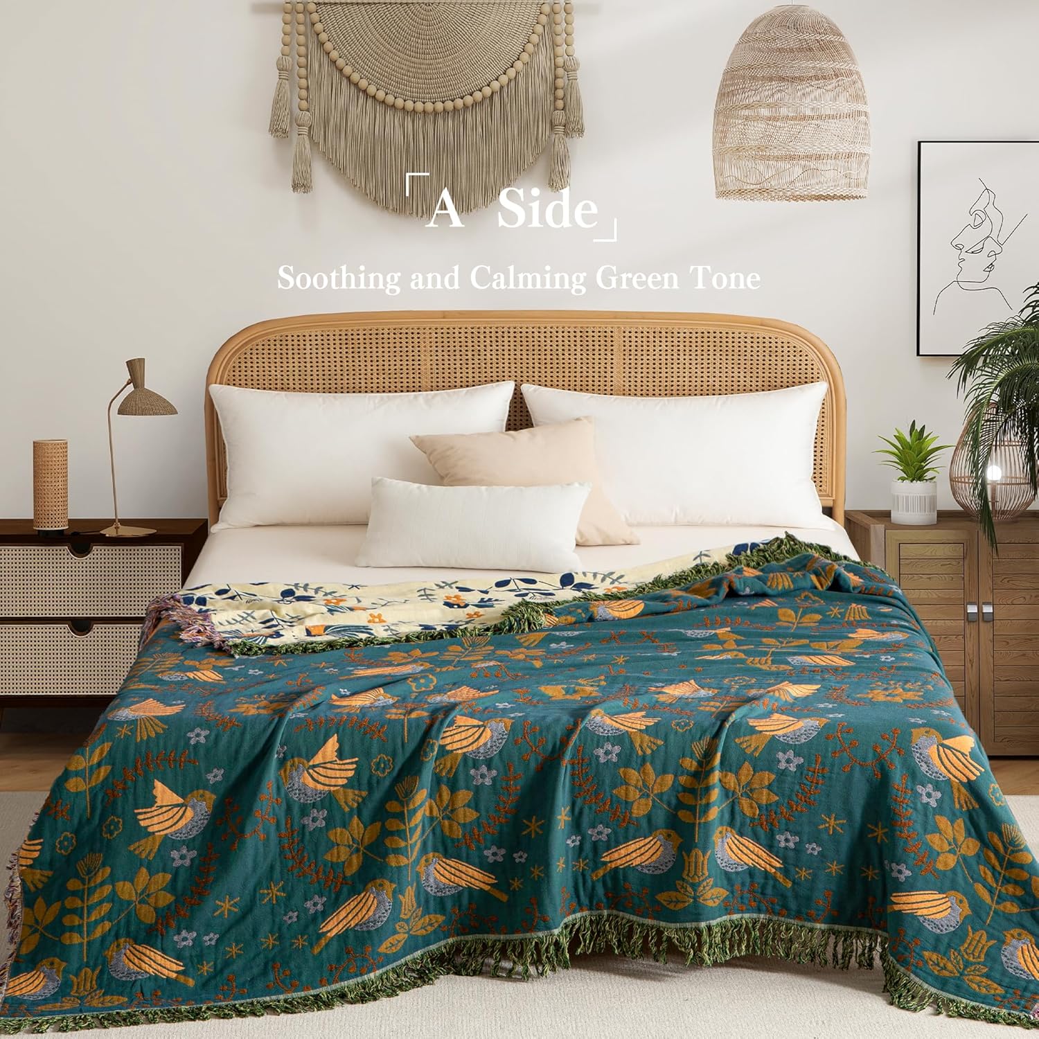 Boho Throw Blanket Full Size, Extra Large Soft Cozy Cotton Muslin Quilt Blanket for Bed Decor, Bird Patterned Couch Sofa Chair Cover, Vintage Farmhouse Cottage Woven Blanket, Green&Beige