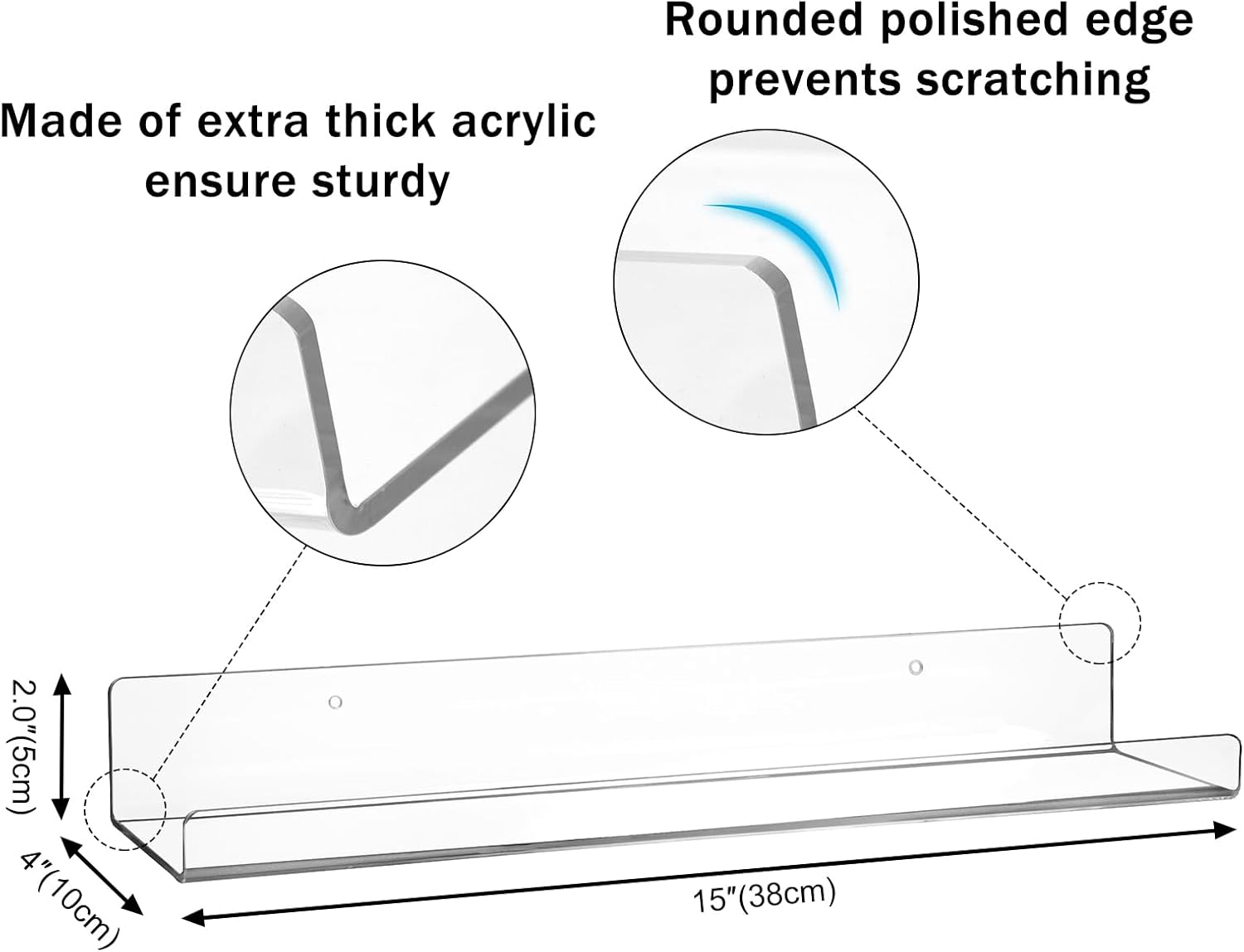 4 Pack Clear Acrylic Floating Shelves for Wall, 15'' Plastic Wall Mounted Display Shelf Kids Bookshelf and Spice Organizer for Bedroom, Living Room, Kitchen, Bathroom, Office