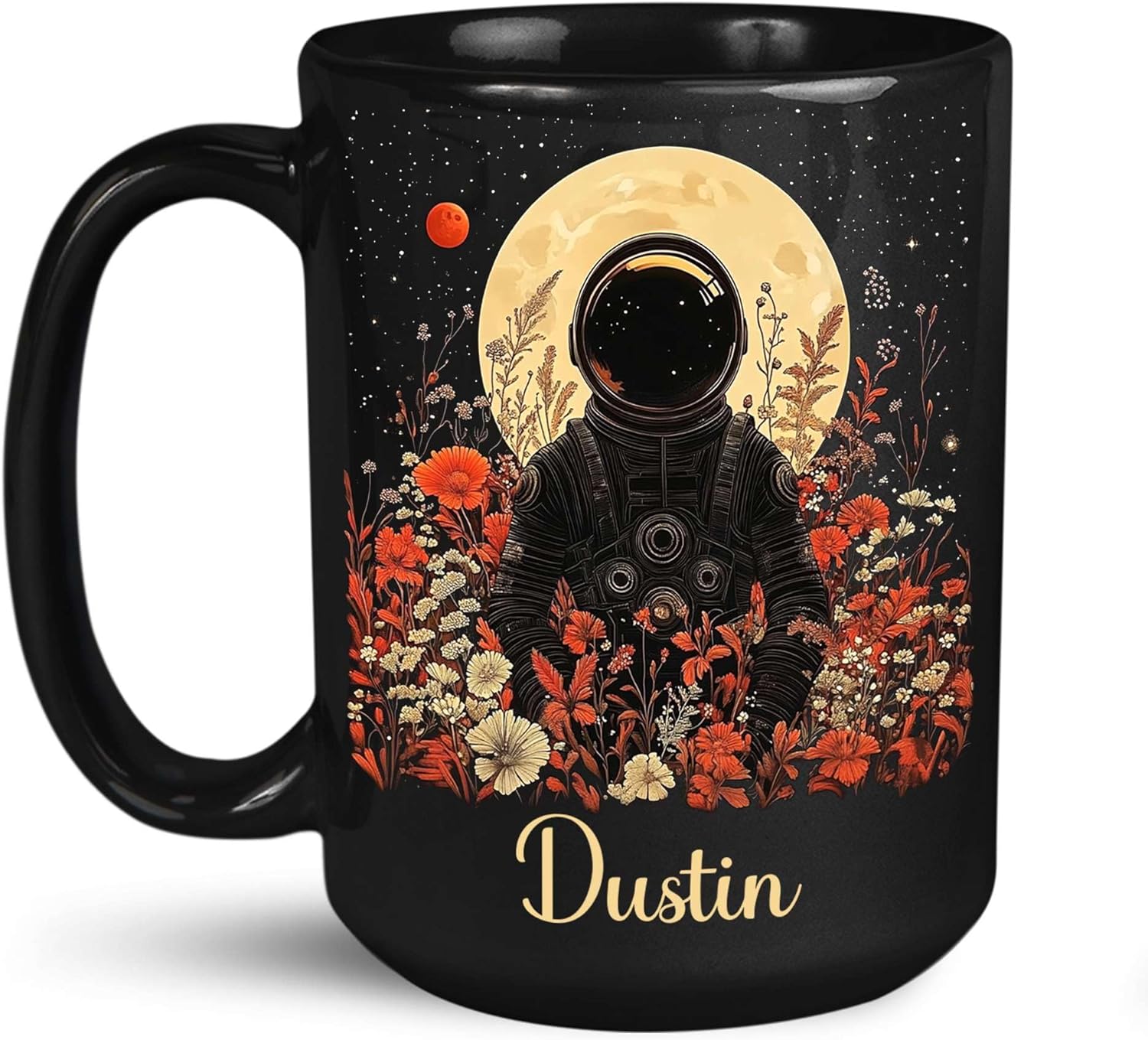 - Uniquely Personalized: Explore the cosmos with this Personalized Astronaut Mug featuring a dreamy moon and wildflowers design. Add a custom name to make it a special gift for friends who love space and nature. A unique astronomy-themed black ceramic cup, ideal for birthdays or everyday wonder. Click "Customize Now" to create your one-of-a-kind celestial mug!