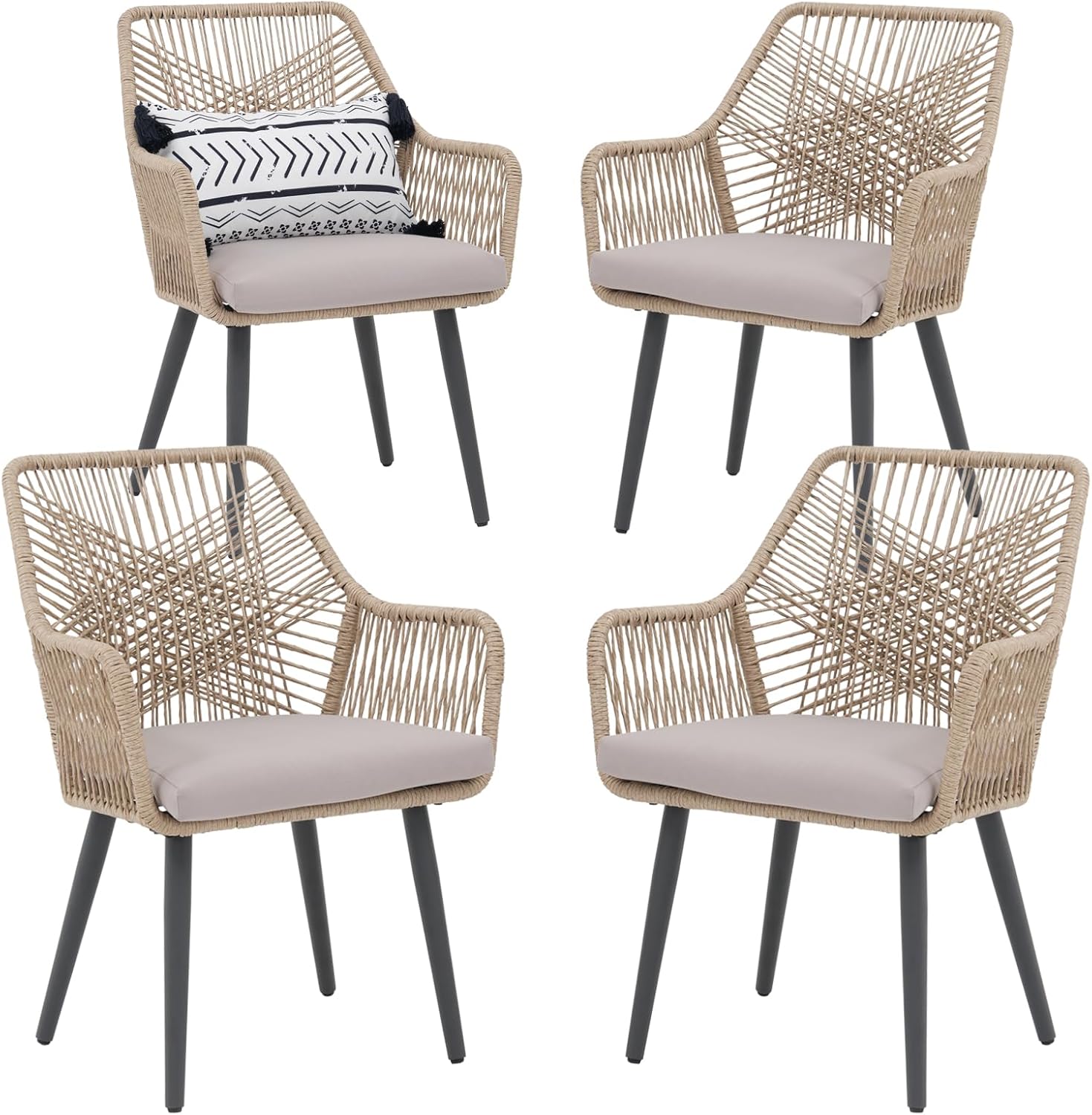Patiorama Patio Dining Chair Set of 4, Woven Rope Outdoor Dining Chairs w/Steel Frame, All-Weather Twisted Rattan Chairs w/Armrest & Cushion, Outdoor Dining Wicker Chairs for Backyard Garden(Beige)