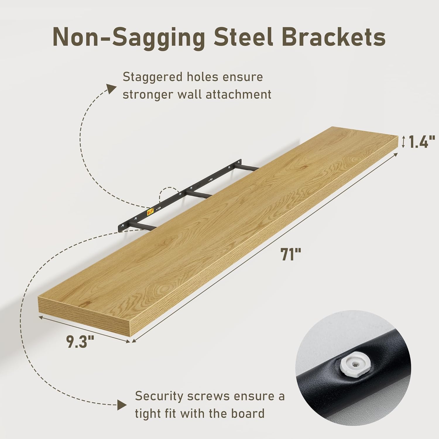 Fun Memories 72 Inch Floating Shelves for Wall 2 Pack Shelves for Bedroom|Kitchen|Bathroom 72 x 9.3 Inch Wood Floating Shelf with Invisible Brackets for Books|Storage|Decor, Oak