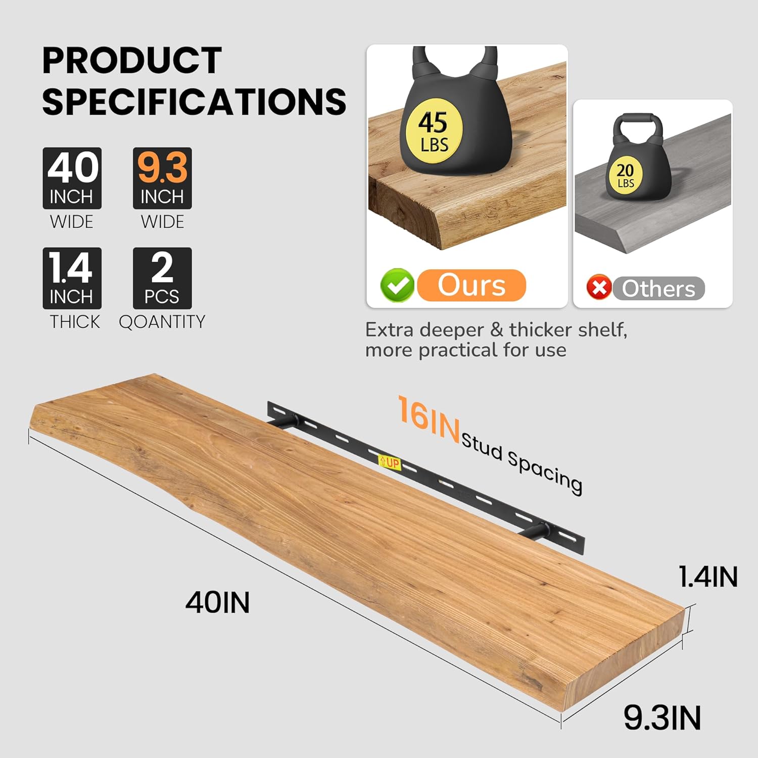 Floating Shelves for Wall, Live Edge 40"W x 9.3"D x 1.5"H Wood Floating Shelf, Set of 2 with Invisible Heavy-Duty Metal Bracket, Deep Floating Shelf for Living Room Kitchen, Natural Finish