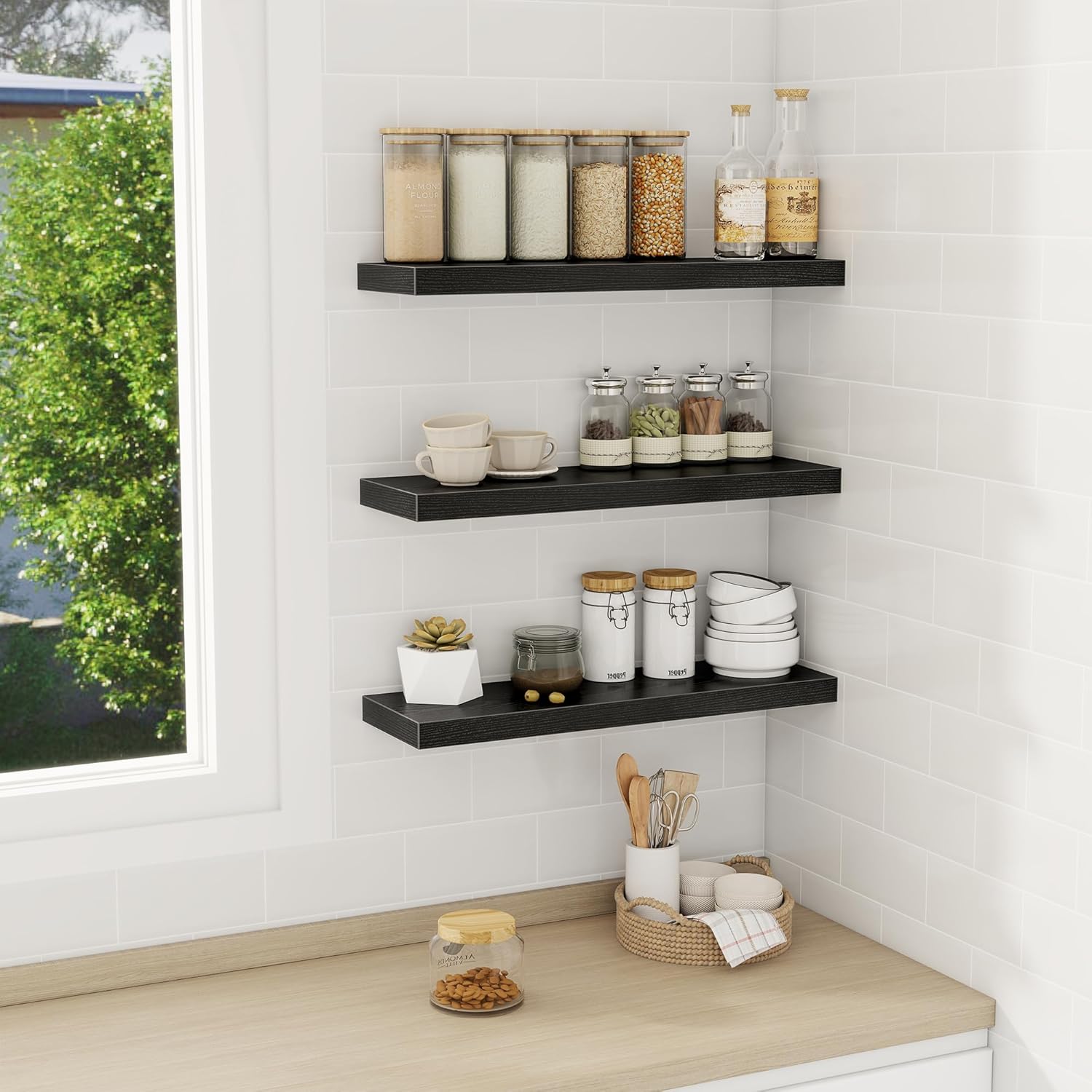 - 24 Inch Floating Shelves for Wall (Set of 3): Each wall shelves are 6.7 inches in depth and 1.4 inches in thickness. 3-piece set is more cost-effective and practical. Our wall shelf can be used in combination, staggered high or low on the wall, or mounted side-by-side to provide extra storage space for organizing small items and clutter in multiple areas such as kitchens, bathrooms, and bedrooms, creating a clean and smooth look. Multiple colors available