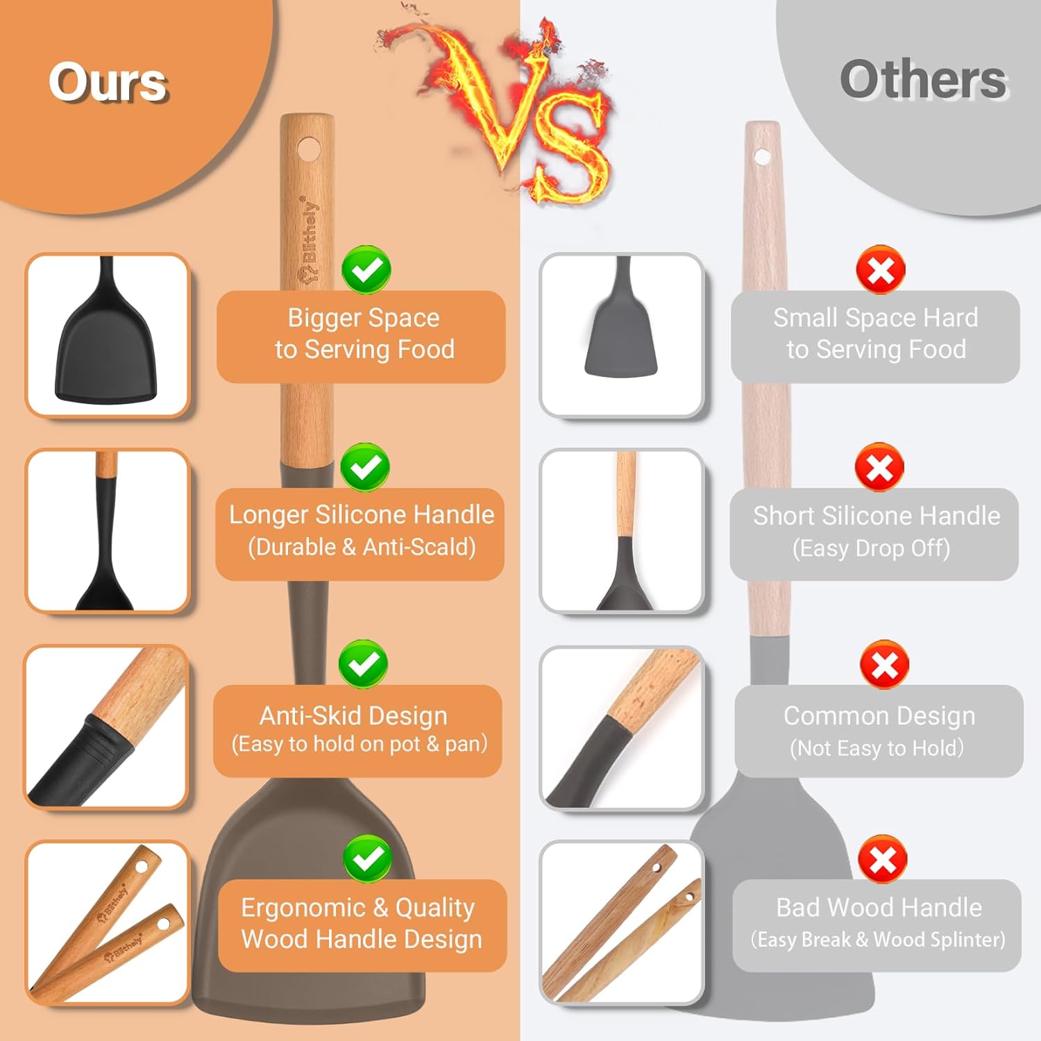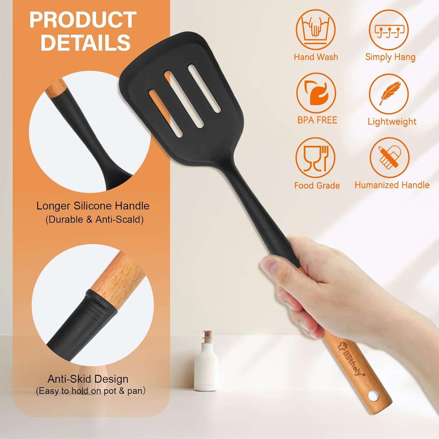- 🏆【Easy to Clean & Attention】Our silicone utensil set have smooth surface which is easy to clean. Attention: This product comes with a natural wood handle. Please do not soak it in water for a long time or use a dishwasher. Avoid using a hard or abrasive dishwashing brush to clean the wooden handle. It is recommended to clean it by hand with clean water or gently wipe it with a soft cloth. Make sure the wooden handle is completely dry before storage.