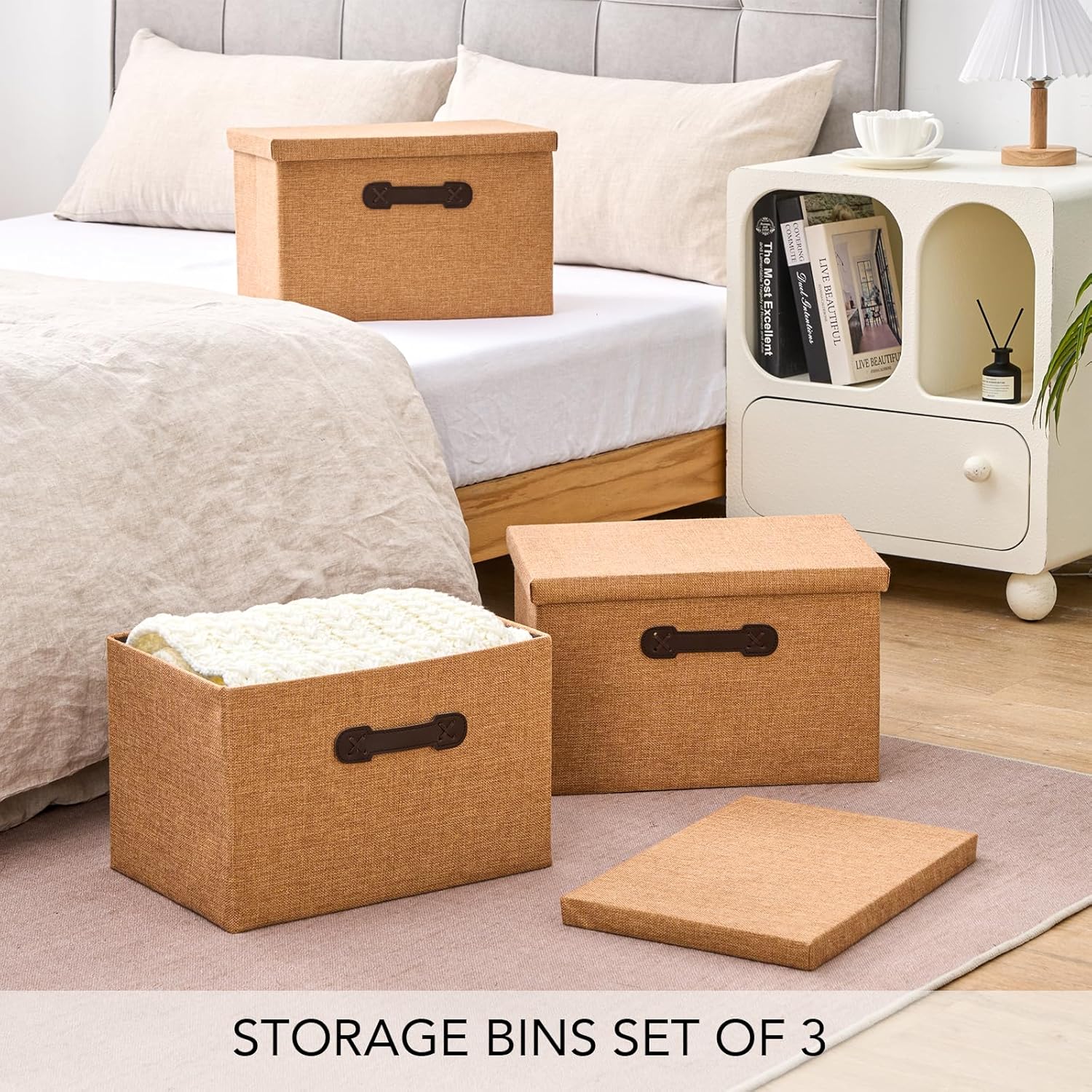 Enzk&Unity Decorative Storage Bins with Lids, Fabric Linen Foldable Storage Box with Handle Home Organizer for Shelf, Closet, Bedroom, Living Room, Office, 3 Packs, Brown