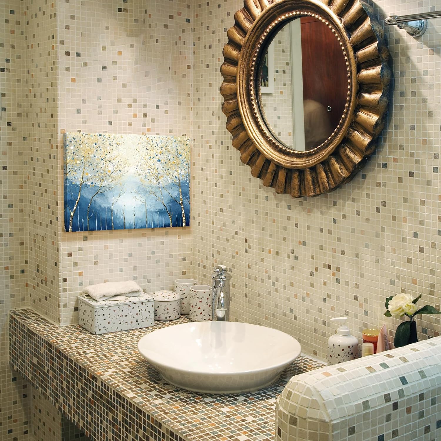 - Modern Abstract Forest Design: This minimalist landscape art captures slender birch trunks reaching toward a luminous sky, showered with soft golden and navy-blue splatters that evoke morning light filtering through the trees. The calming blend of cool and warm hues makes it an effortless accent for any room.