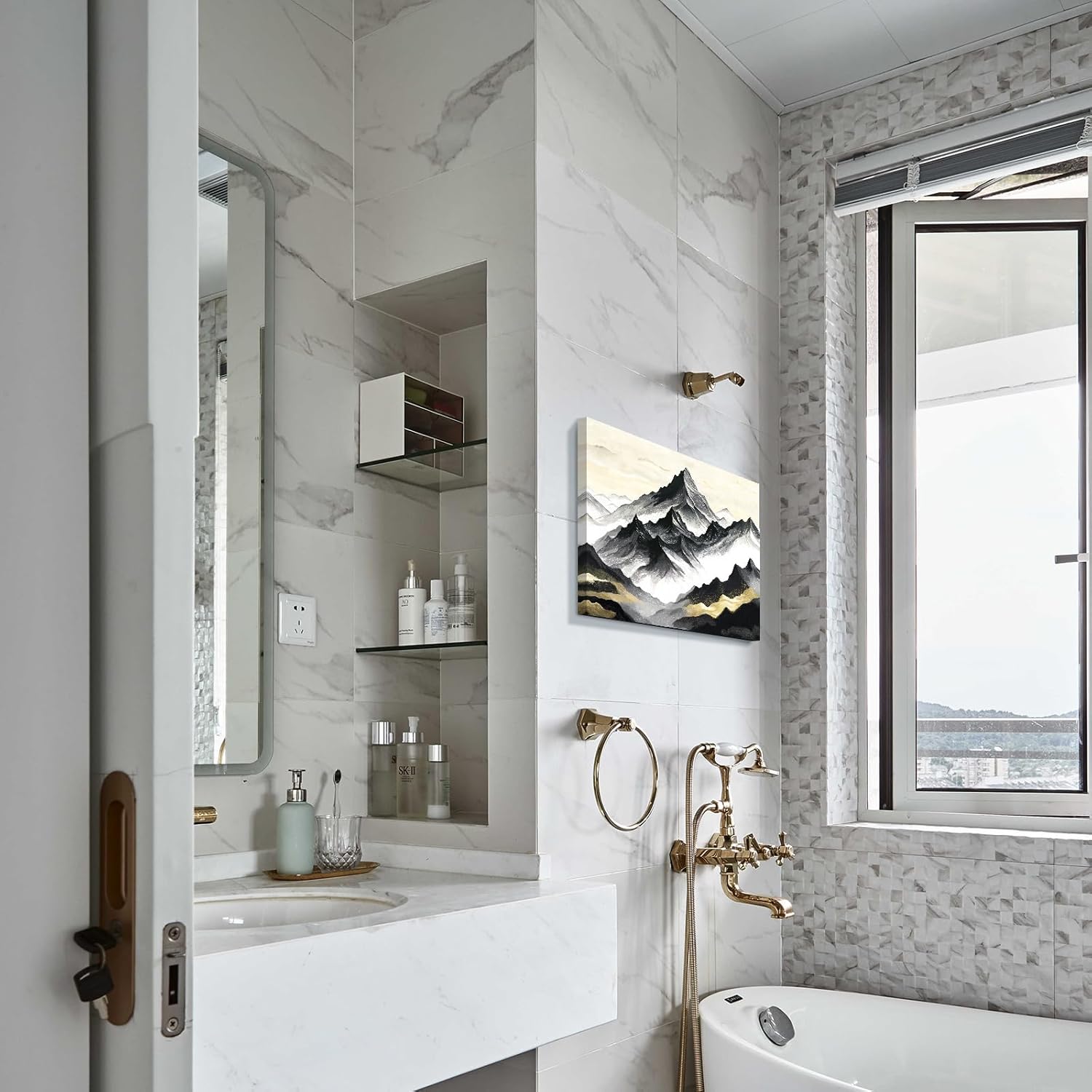 - Timeless Mountain Elegance: A striking mountain landscape in black, white, and gold tones, blending ink-style brushwork with abstract minimalism. The peaceful, high-contrast design evokes feelings of clarity, quiet strength, and introspection instantly elevates any room with serene depth.