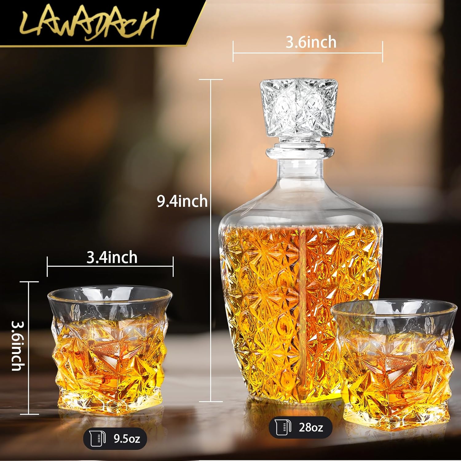 - Excellent Whiskey Decanter Set 🥂 If you're looking for a suitable whiskey decanter, then this is what you're looking for. The decanter set comes with a glass liquor decanter and two whiskey glasses, it's time to invite your friends for a toast!
