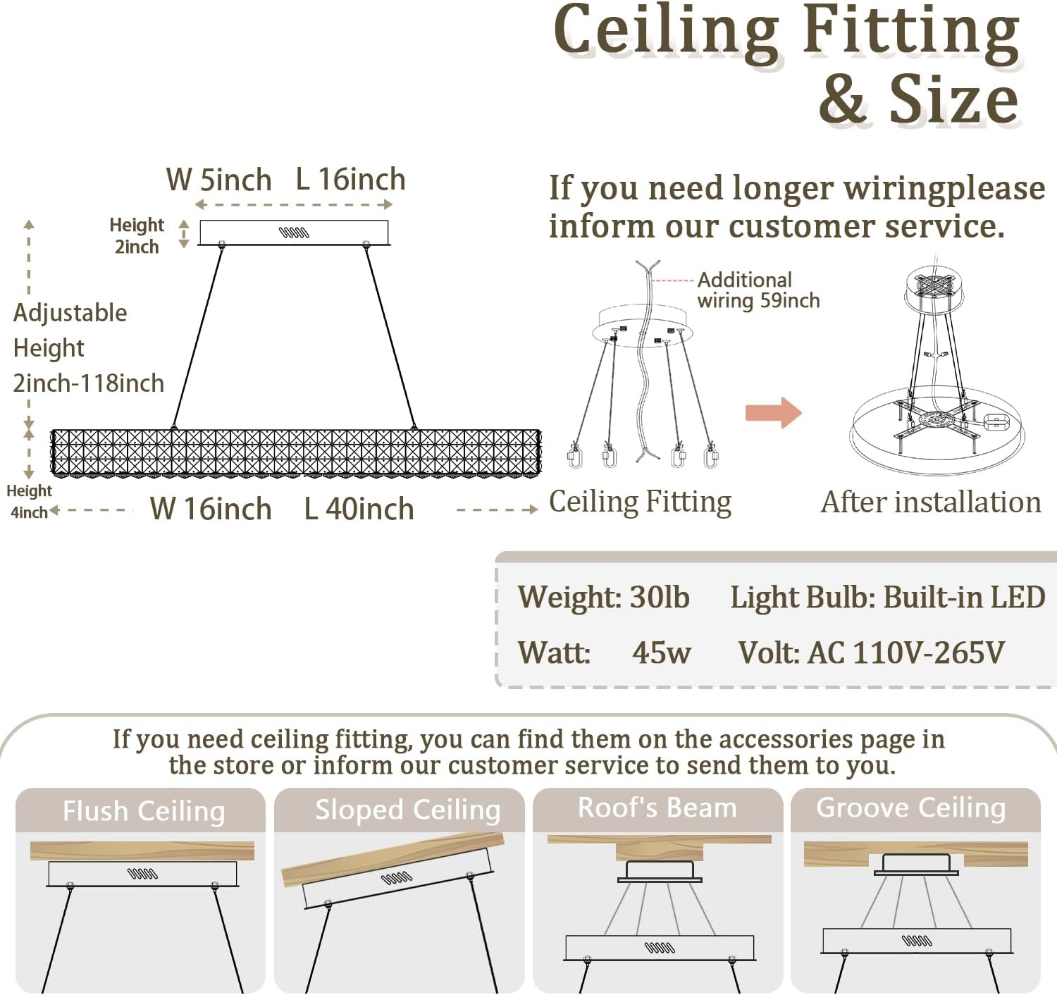 - 【Rectangular Pendant Light size】Dimensions: L40" x W16" x H4". The pendant cord is adjustable, with a maximum hanging height of 118". Its elegant design allows it to blend effortlessly into a variety of interior spaces, making it a striking focal point in living rooms, dining rooms, or entryways.