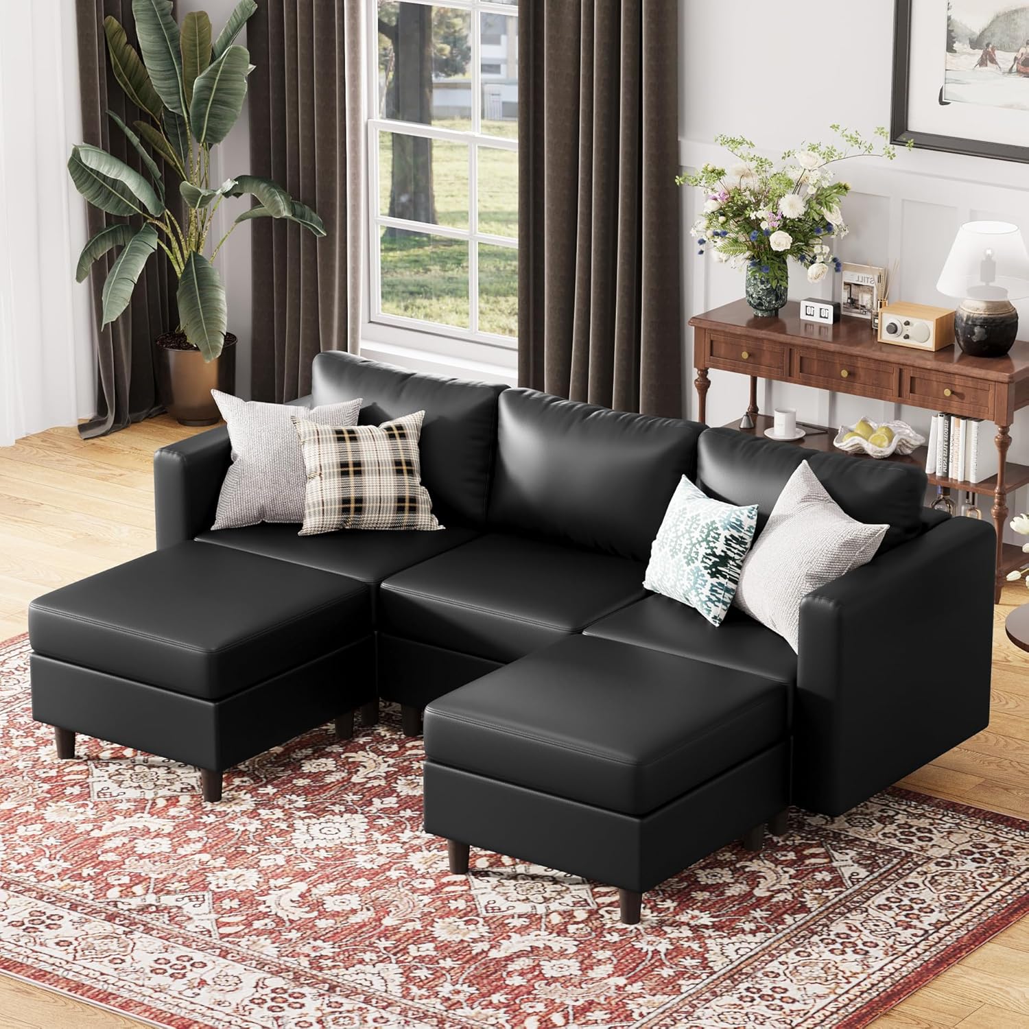 91.5" Faux Leather U Shaped Modular Sectional Sofa, 5 Seater Couch with Movable Ottoman Deep Seat and Storage Seat with Removable Cover for Living Room, Apartment - Black