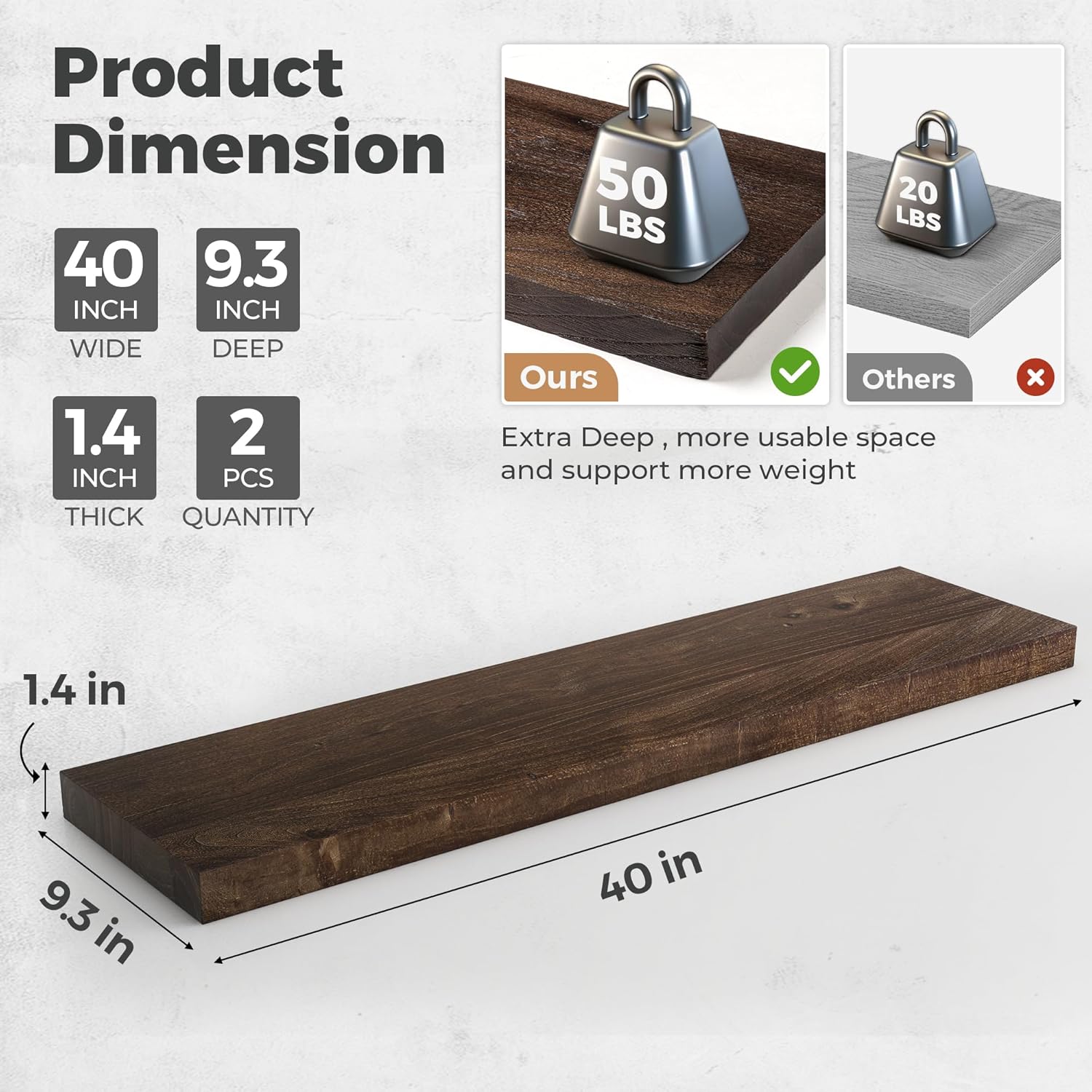 RICHFOCUS Elm Floating Shelves for Wall - 40" W x 9.3" D Rustic Solid Wood Shelves with Invisible Bracket, Wall-Mounted for Living Room, Bedroom, Kitchen Storage & Display, Set of 2, Walnut