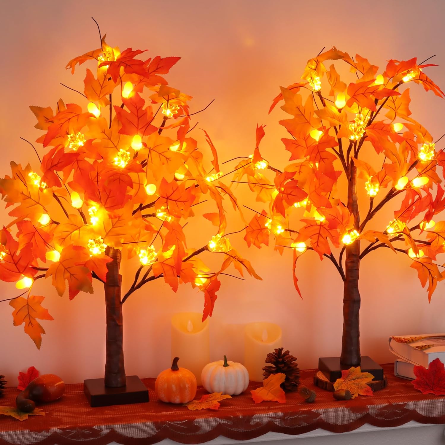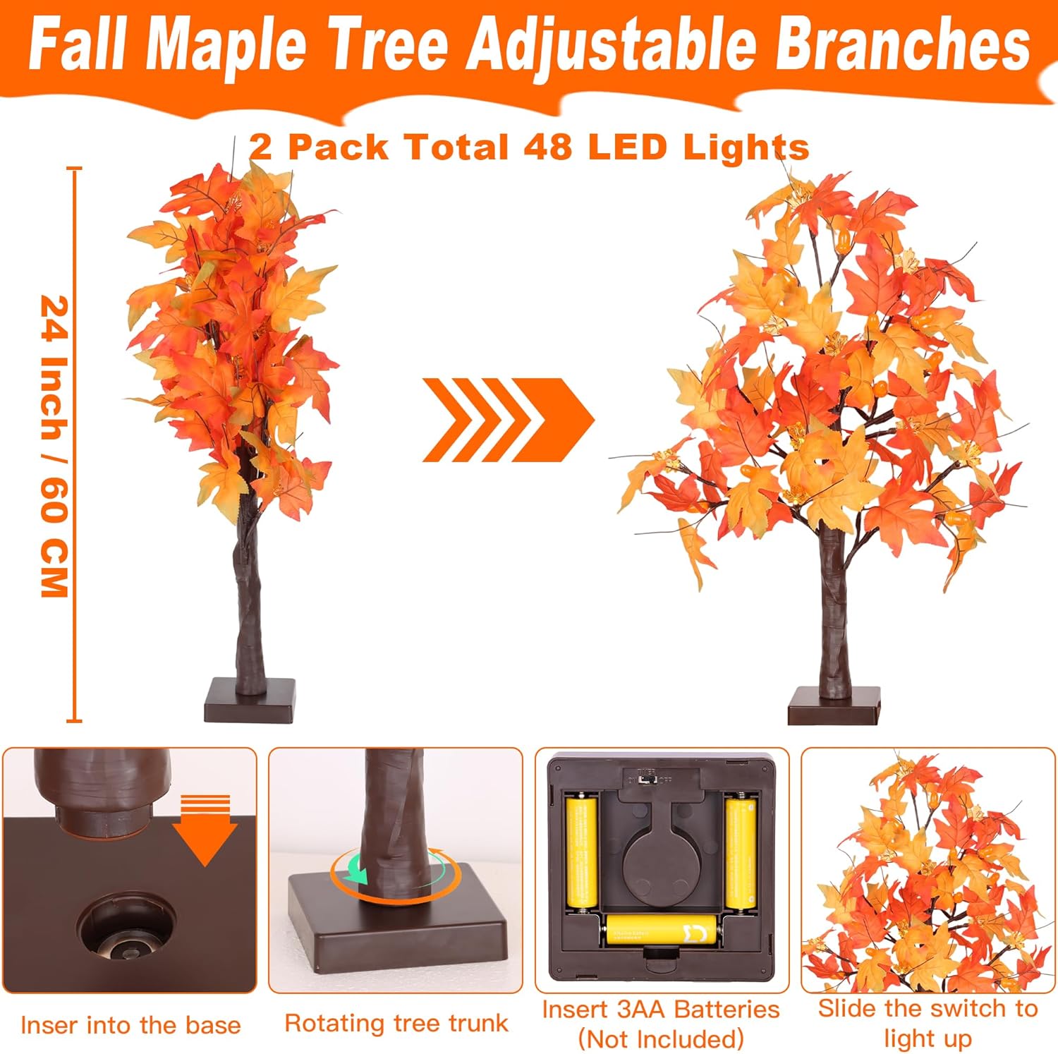 2 Pack 24 Inch Prelit Fall Maple Tree Fall Decor with 48 LEDs Timer Battery Operated Artificial Fall Light Up Tree Maple Acorn for Fall Thanksgiving Decorations Table Home Office Indoor Autumn Harvest