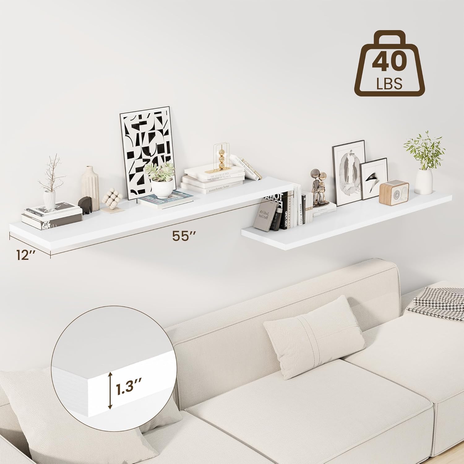 55" Floating Shelves for Wall, 12" Deep Slim White Floating Shelves, Wall-Mounted Shelves for Bedroom, Living Room, Kitchen, Bathroom - Set of 2