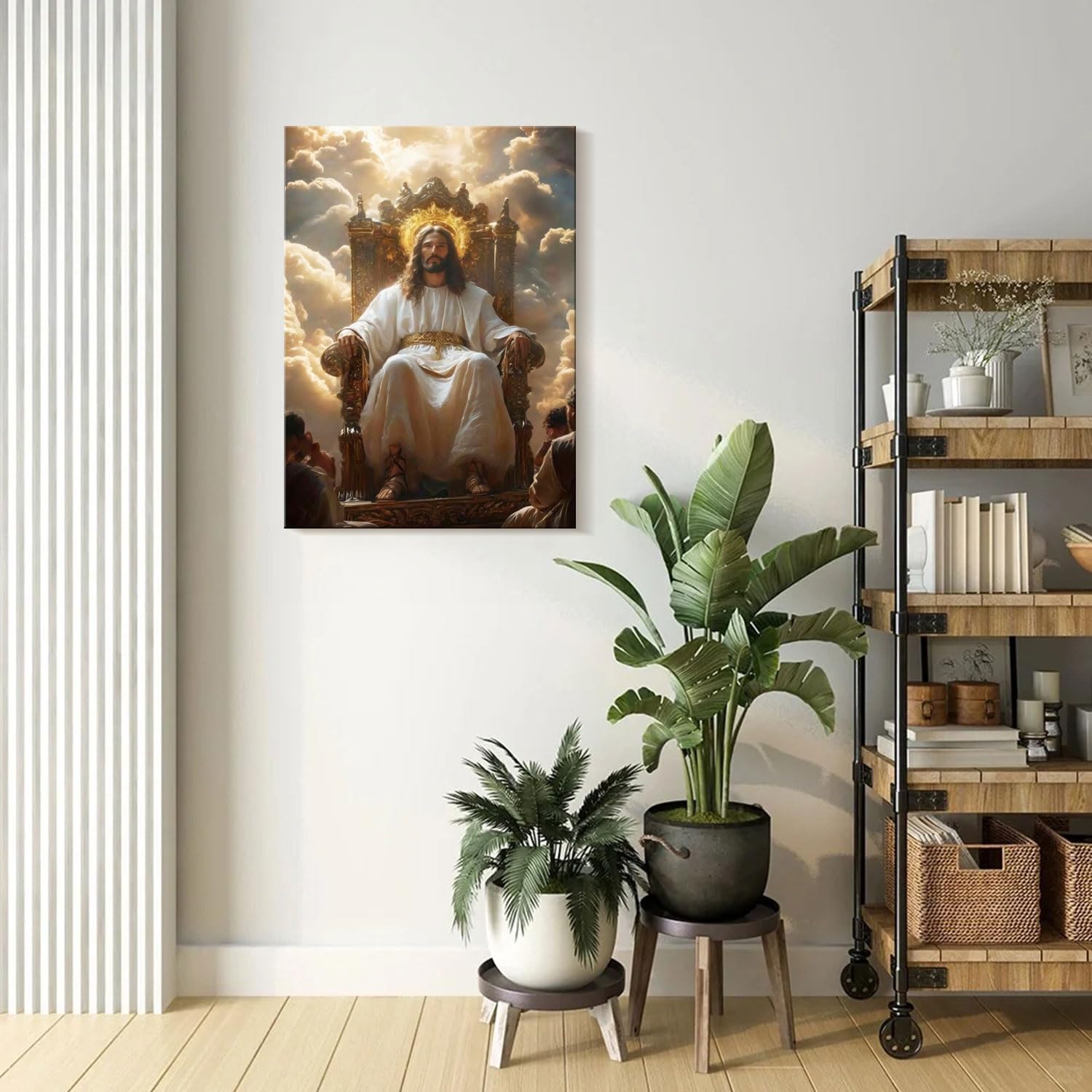 - Majestic Religious Imagery This canvas wall art showcases a powerful image of Jesus seated on a golden throne among the clouds, symbolizing divinity, authority, and eternal peace. A bold statement of faith for any space.