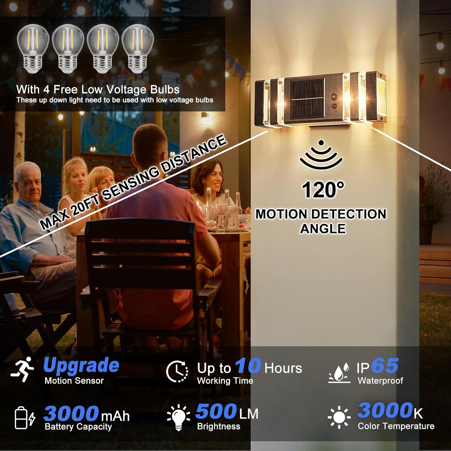 - 💡【INCLUDE 4 FREE 4W E26 3000K BULBS】These solar exterior light fixtures is compatible with all types of E26 base of low voltage light bulb. 💡Each DELICAVY solar sconce light is comes with 2 4W Low-Voltage LED warm white bulbs. 【If you need to purchase your own bulbs, it is recommended that you use 2 E26 low voltage bulbs within 2.3 inches in diameter and 3.7 inches in height.】