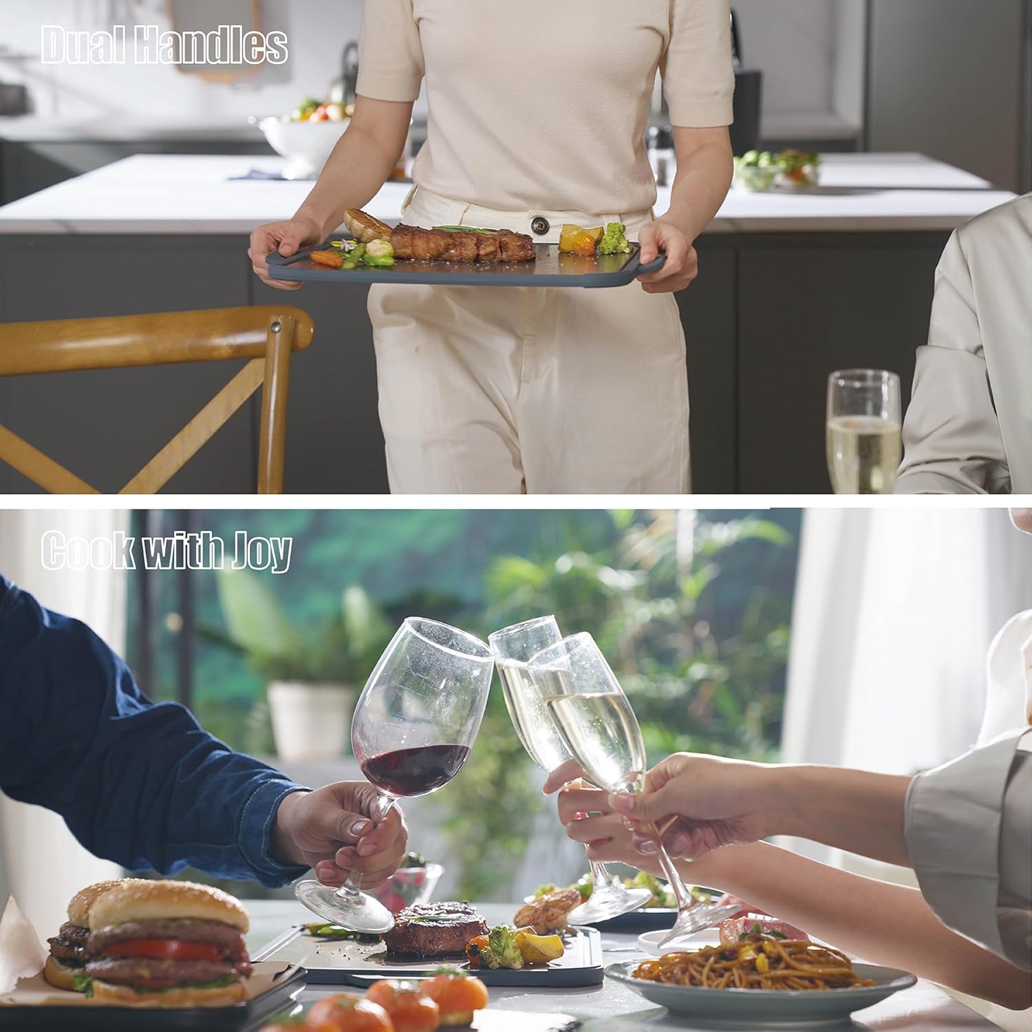 - Time-Saving Titanium Cutting Board Features That Wow Juice Groove: No more sticky countertops! The deep groove holds up lots of liquid, catching all the meat juices and fruit drips. Say hello to a cleaner, faster prep! Garlic Grinding Zone: Skip the extra dishes and grind your garlic and ginger right on the board. Dinner's ready in a flash!
