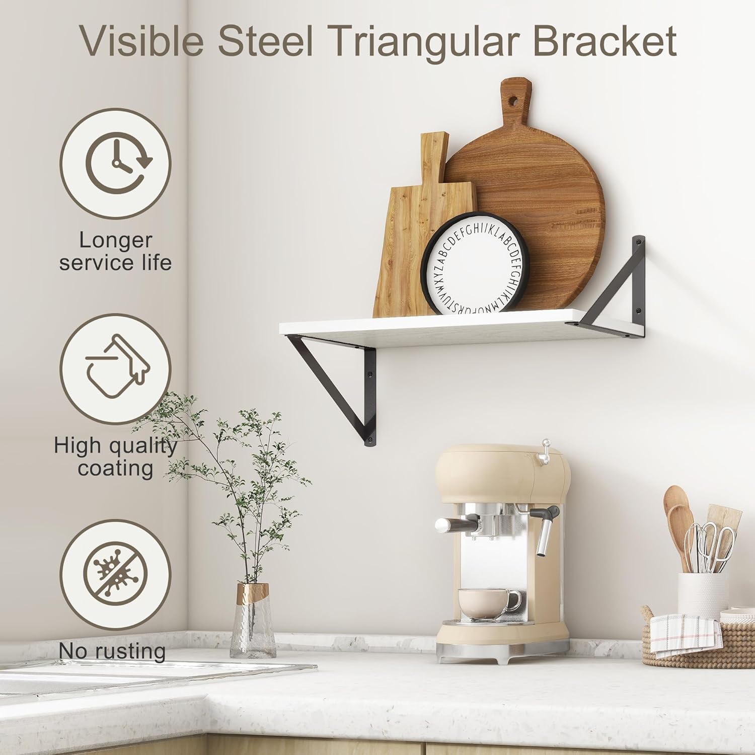 - ăDECORATIVE & FUNCTIONALăThe wall-mounted floating shelves are designed for decoration and storage, utilizing and decorating any space in your home. Used as shelf decor to show your collection, books, or prize, the hanging shelves are perfect for displaying your photo frame, small plants, model, or audio in your living room, office, study. And can also use as over the toilet storage shelf in the bathroom to hold toiletries or used as kitchen shelf to storage condiments.