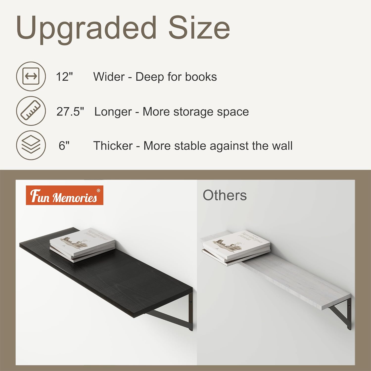 - ă12 INCH DEEP FLOATING SHELFăThis extra deeper and wider wall shelves are 12 inches in depth and 27.5 inches in length instead of the regular narrow floating shelves, you can put photos, pictures, DVD players, videos, books, toys, and some other knickknack on this beautiful display wooden shelf.