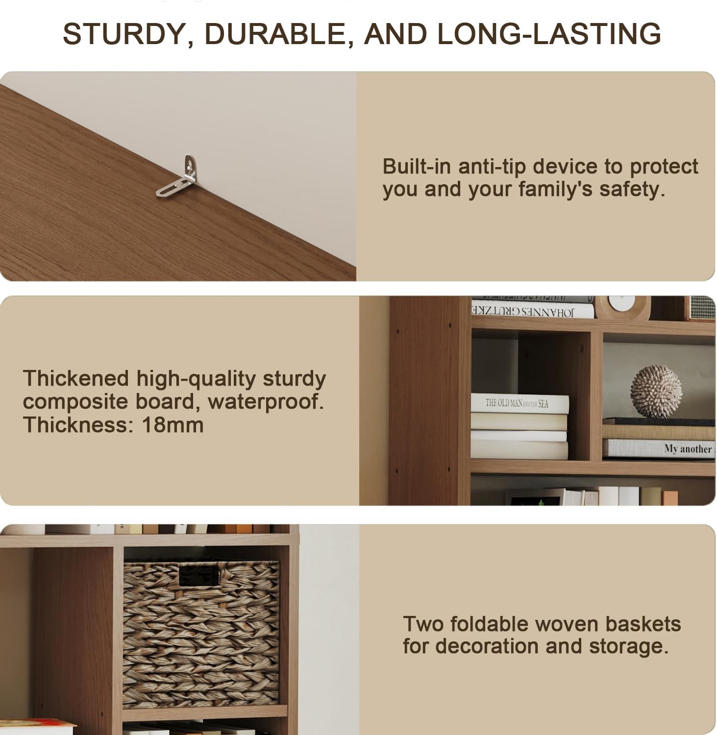 6-Tier Large Open Bookcase 71” Tall Sturdy Wooden Bookshelf with Baskets,Modern Style 16-Cube Home Display Shelf for Bedroom, Living Room(Oak Color)