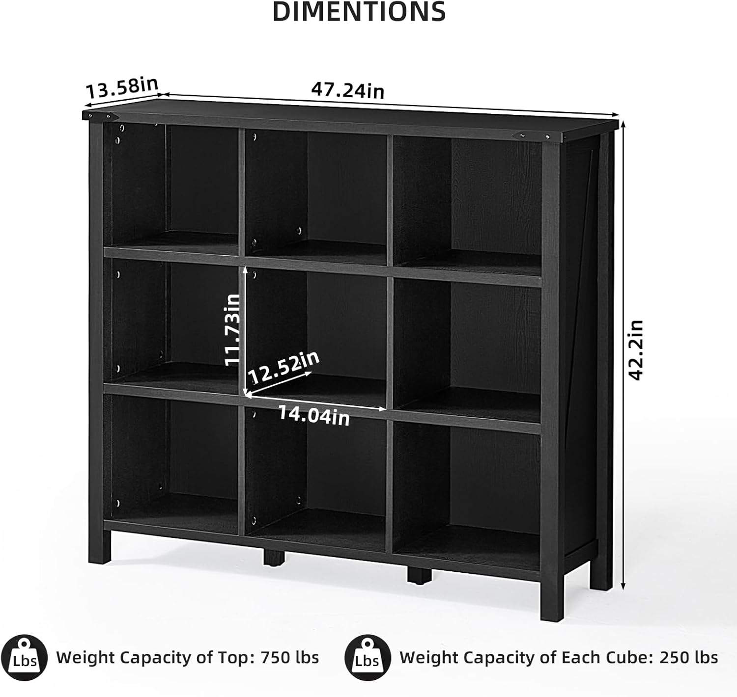 9 Cube Bookcase, Farmhouse 47 Inch Wide Black Bookshelf, Wooden 3 Tier Display Large Open Book Shelf, Vintage Horizontal Book Case for Home Office, Cubby Storage Cabinet for Living Room