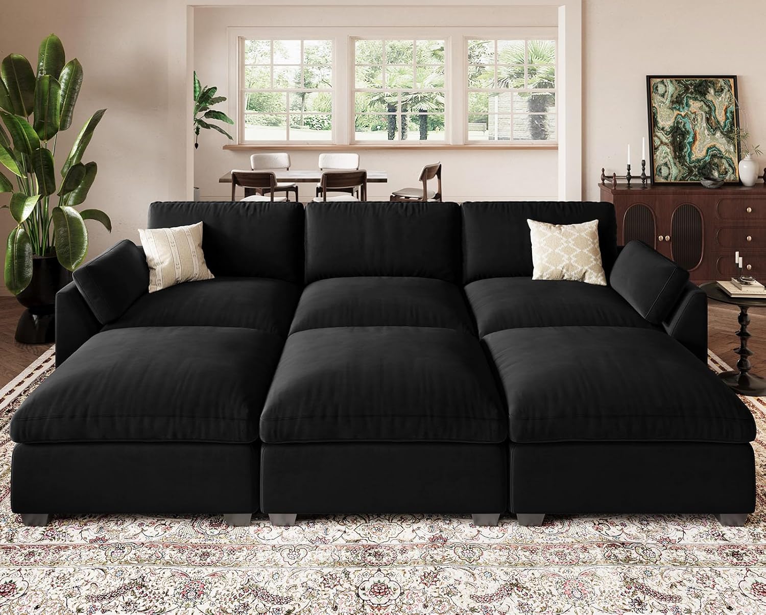 Belffin Sectional Couches for Living Room,106.3" 6-Seater Sleeper Sofa Bed,Extra Deep Seat Velvet Cloud Couch with Ottoman,Modular Sectional Sofa with Washable Covers,Black