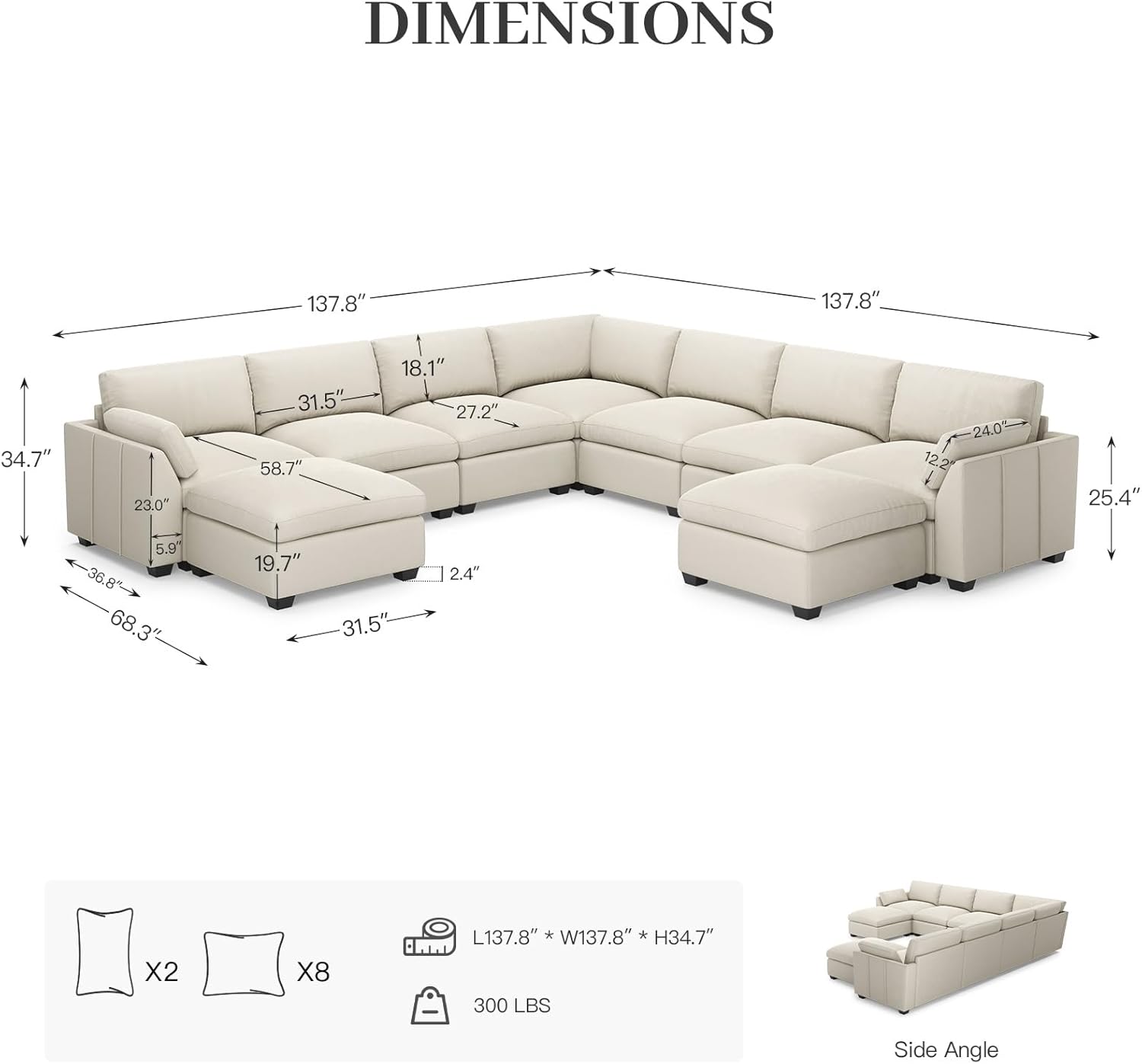 Belffin Oversized Sectional Couch with Movable Ottoman,Modern 137.8" 9-Seater Modular Sectional Sofa,Convertible Velvet U Shaped Sectional Couches for Living Room,Beige
