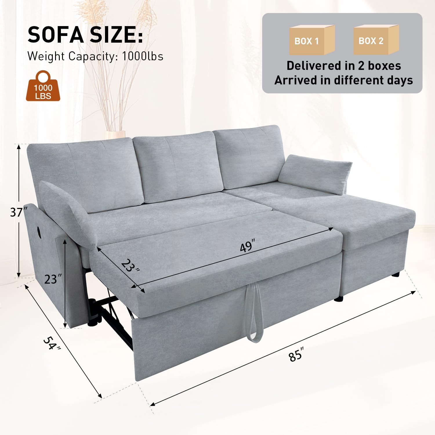 Waxberry Sectional Sofa Couch, Pull Out Couch Sleeper Sofa Bed with Storage for Living Room, Reversible Chaise, Side Pockets & Dual USB/Type-C Ports, Grey