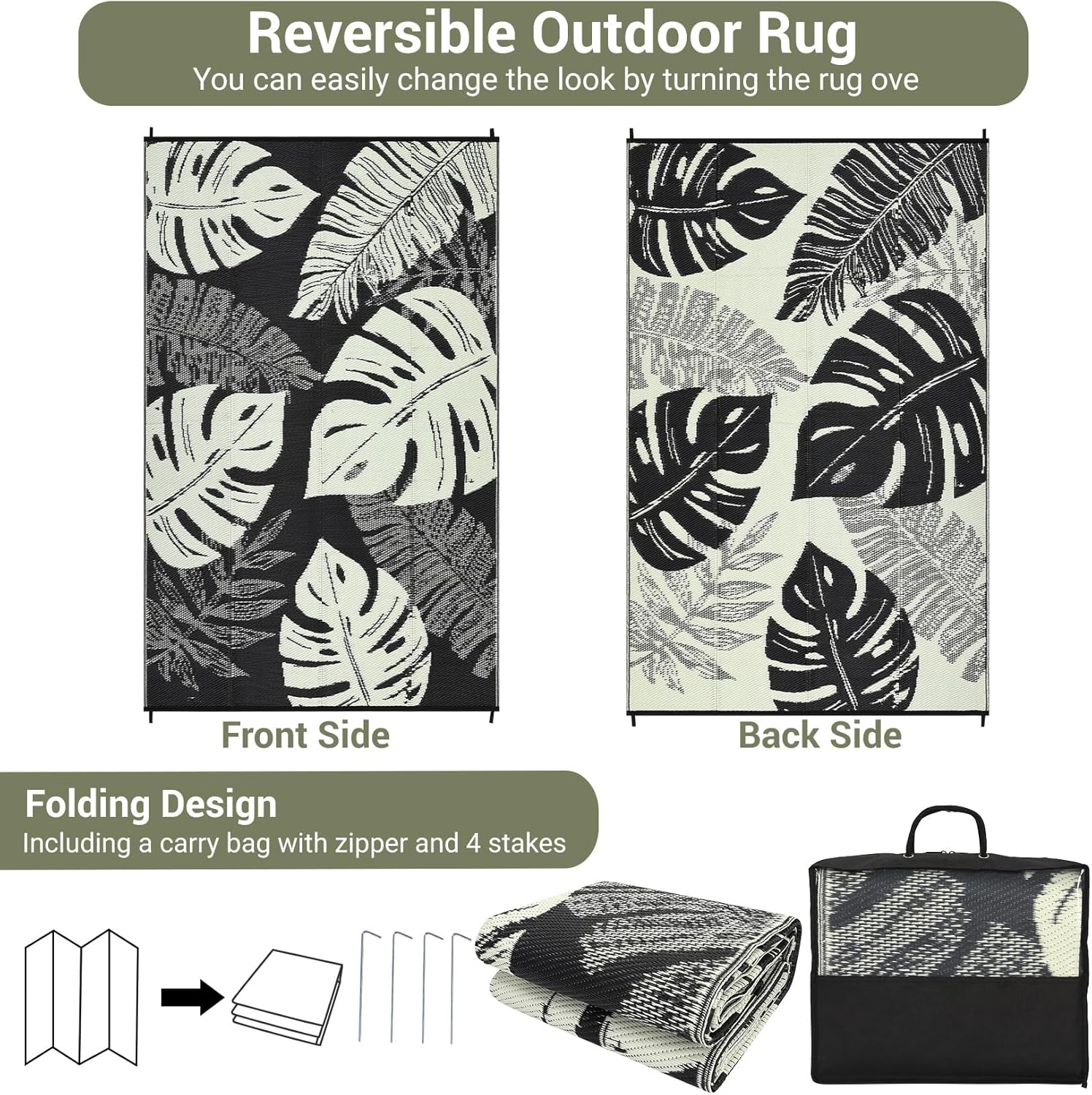 - Modern Reversible Design: Refresh any space with this large outdoor rug featuring a tropical leaf pattern. The reversible style gives you two trendy looks in one, making it a versatile outdoor mat for patios, decks, gardens, and front porches