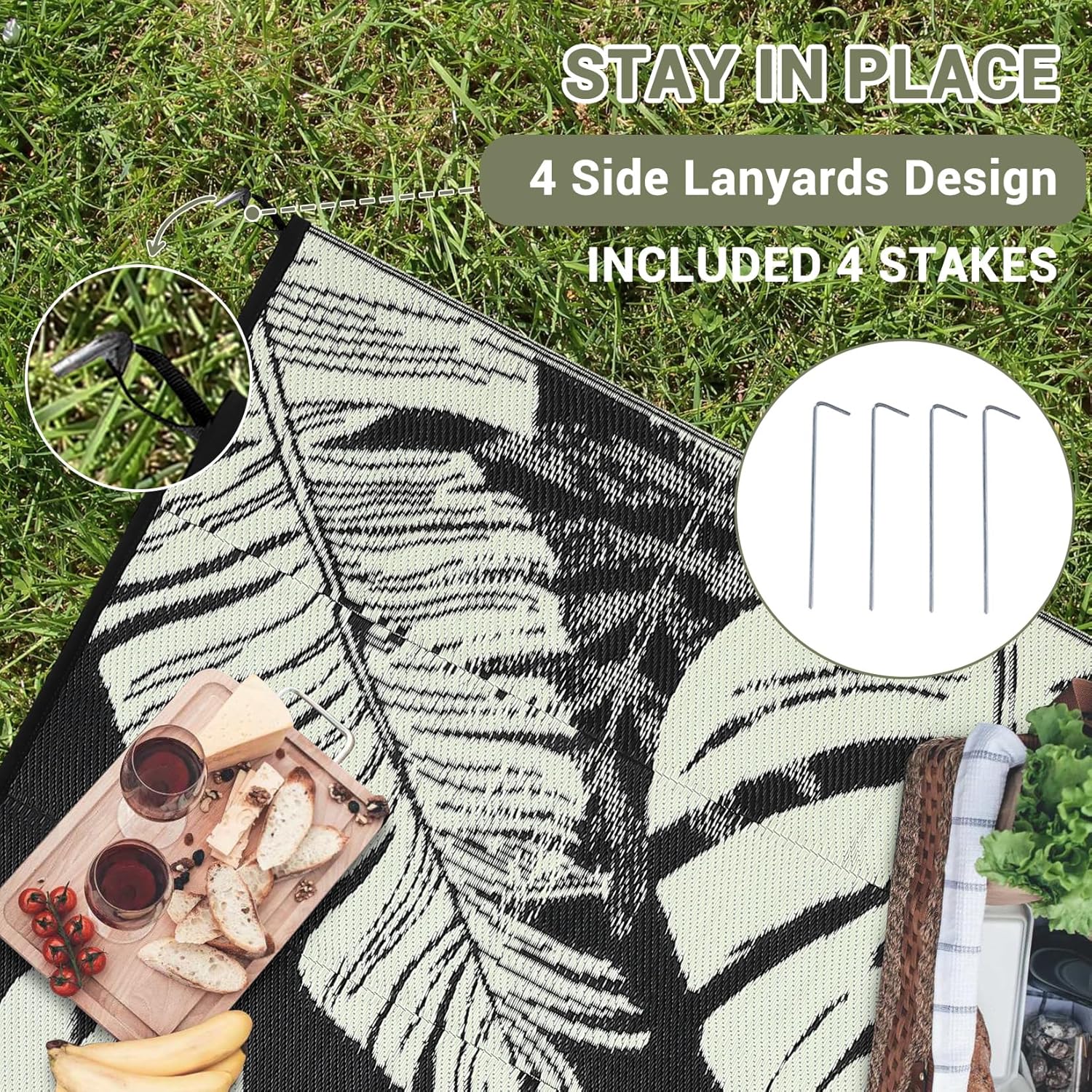 - Foldable & Portable: Take this picnic mat anywhere with its lightweight, foldable design. Includes four stakes and a portable bag for secure placement and easy transport, making it ideal as a beach mat, camping rug, or travel deck rug for outdoor fun