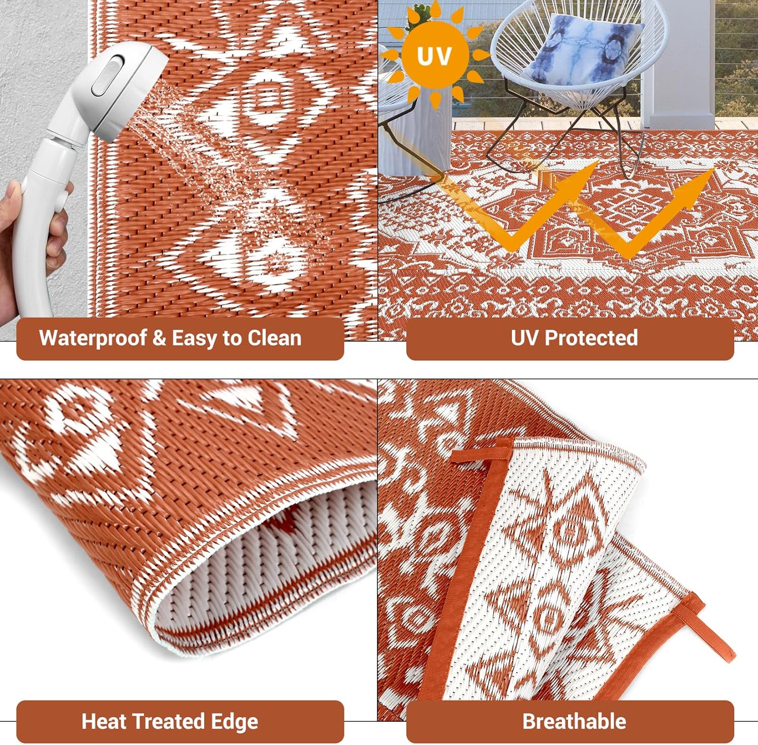 GAOMON Large Outdoor Plastic Straw Rug 10x14 Waterproof Patio Rug Reversible Foldable Portale Camping Mat with Stakes & Bag, Vintage Boho Outside Carpet for RV Garden Deck Porch, Orange Red