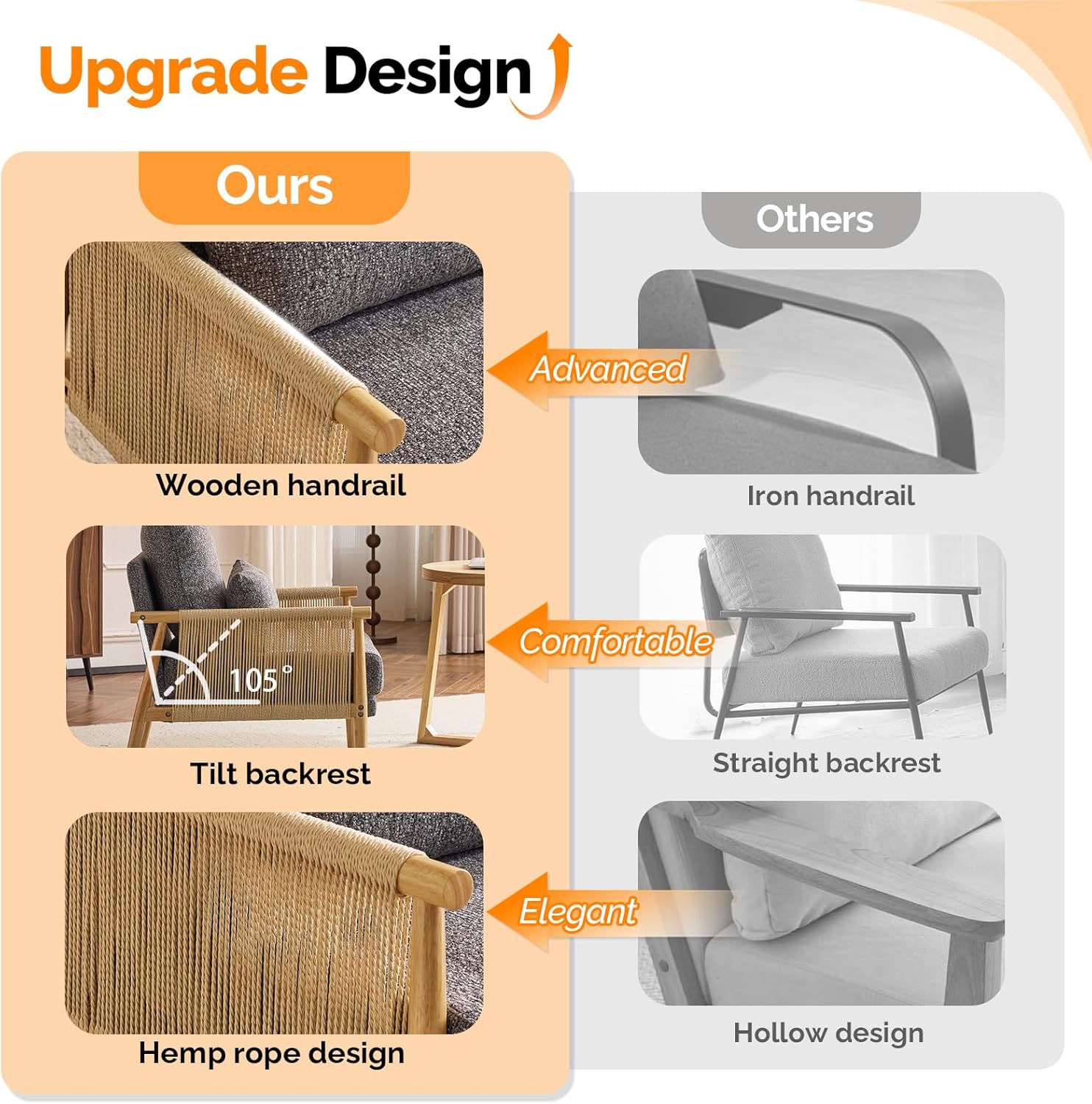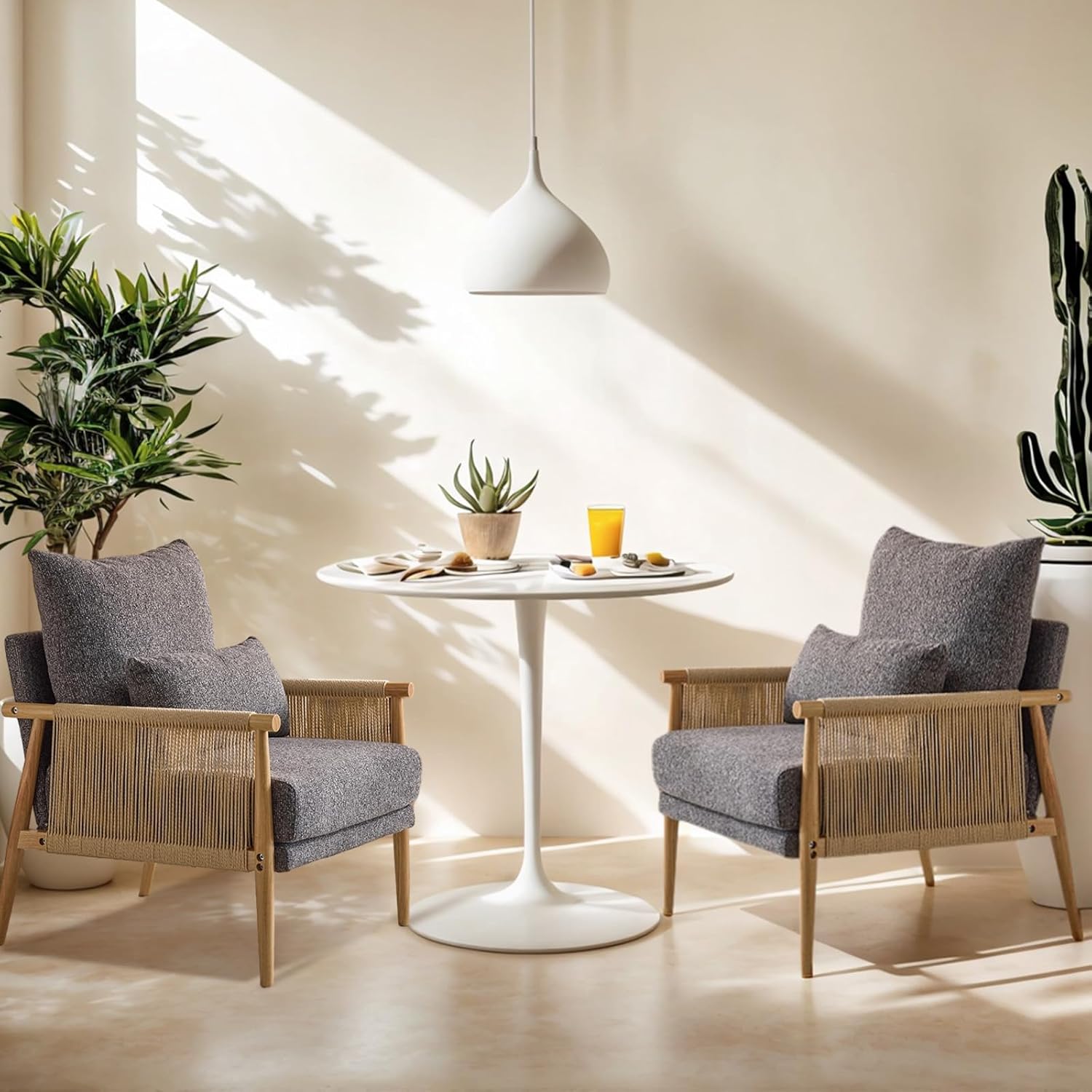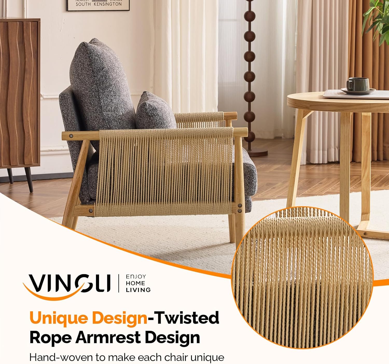 - Braid Design : The Boho-inspired Braid Accent Chair showcases elegant paper cord weaving across its angled armrests. Its thoughtful design combines comfort and style with a medium-height backrest and plush cushioning. This piece seamlessly blends casual and sophisticated interior comfort, perfect for home decoration.The two chairs will be shipped in separate packages. Please note that they may not arrive at the same time.