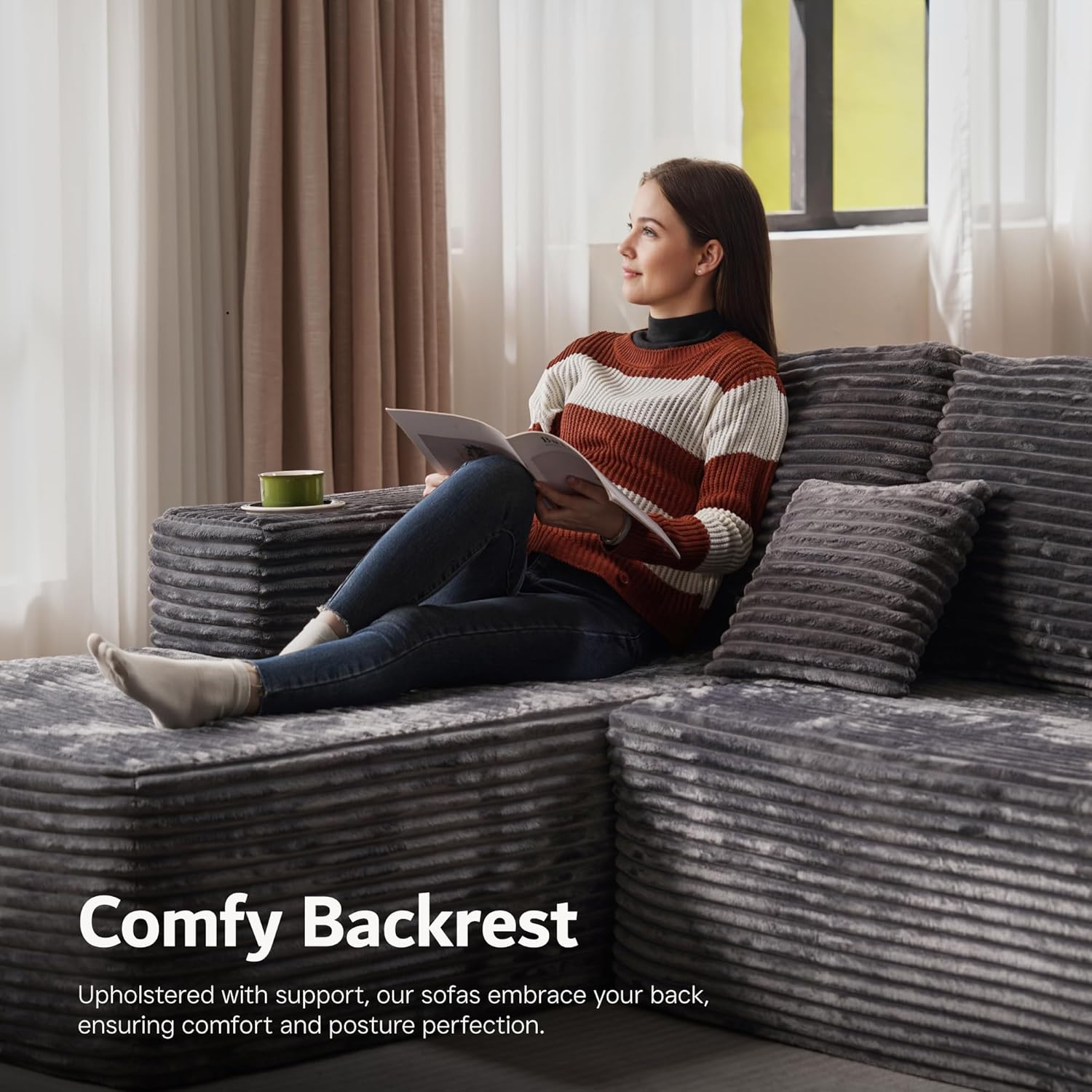 - Sophisticated Modern Design: Upgrade your living room with a plush corduroy sectional sofa. Its sleek, timeless design with clean lines and striped accents adds a sophisticated touch to any decor.