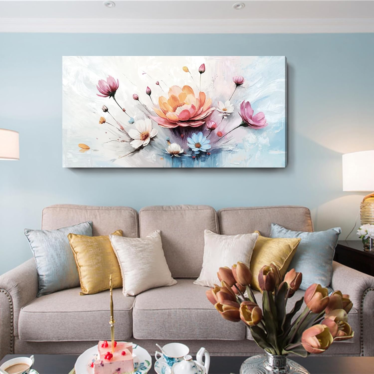 amatop Large Floral Wall Art – Modern Pink White and Blue Abstract Colorful Flower Bouquet Print Large Botanical Canvas Picture Nature Artwork Wall Decor for Living Room Bedroom Office 48x24 inch