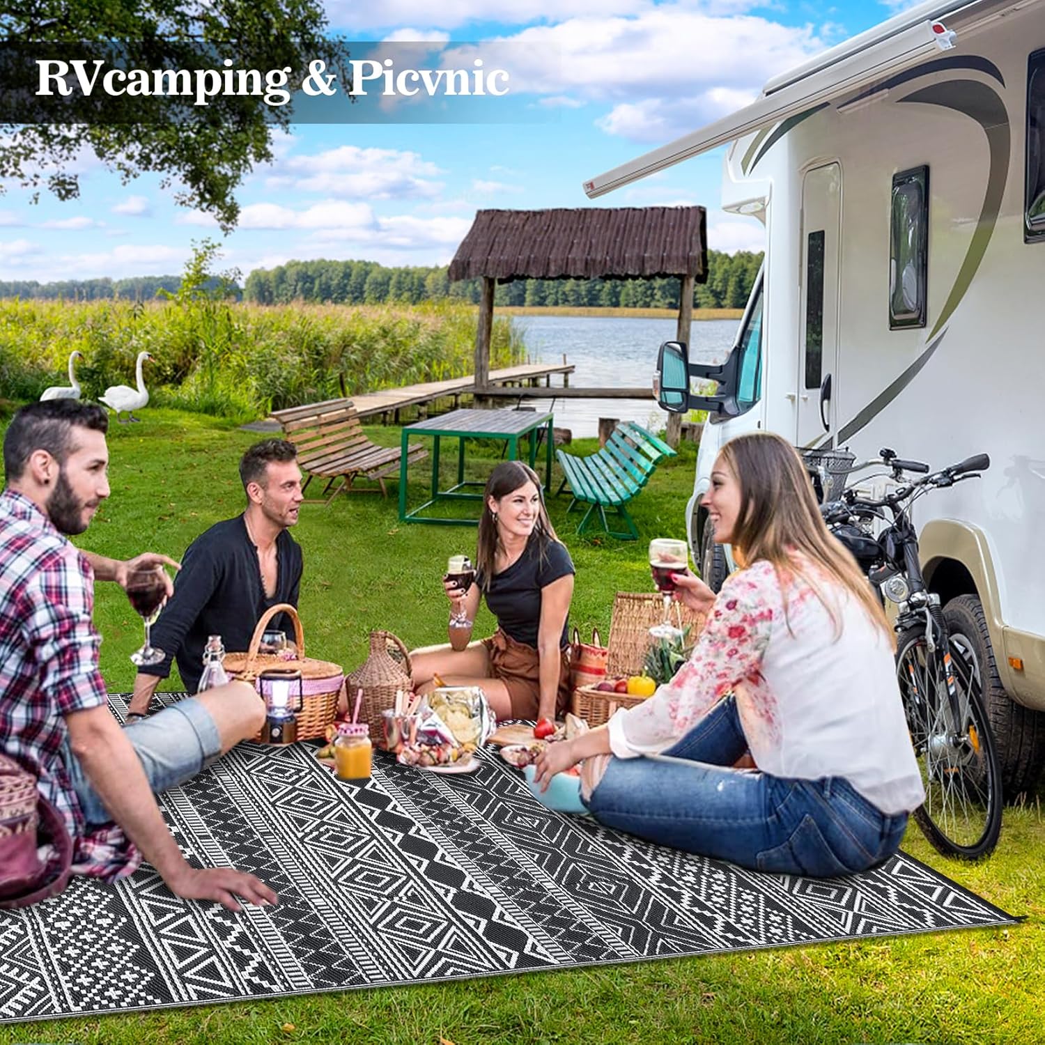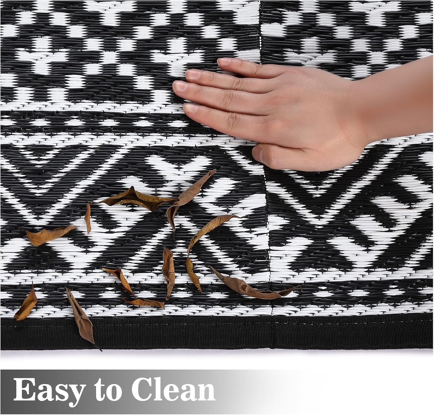 GAOMON Outdoor Rugs Patio Camping Waterproof Rug 6'x9' Plastic Straw Patio Rug Portable for Campers, Outside RVs Mat for Patios Clearance, Backyard Porch, Balcony, Black/White(Bohemia)