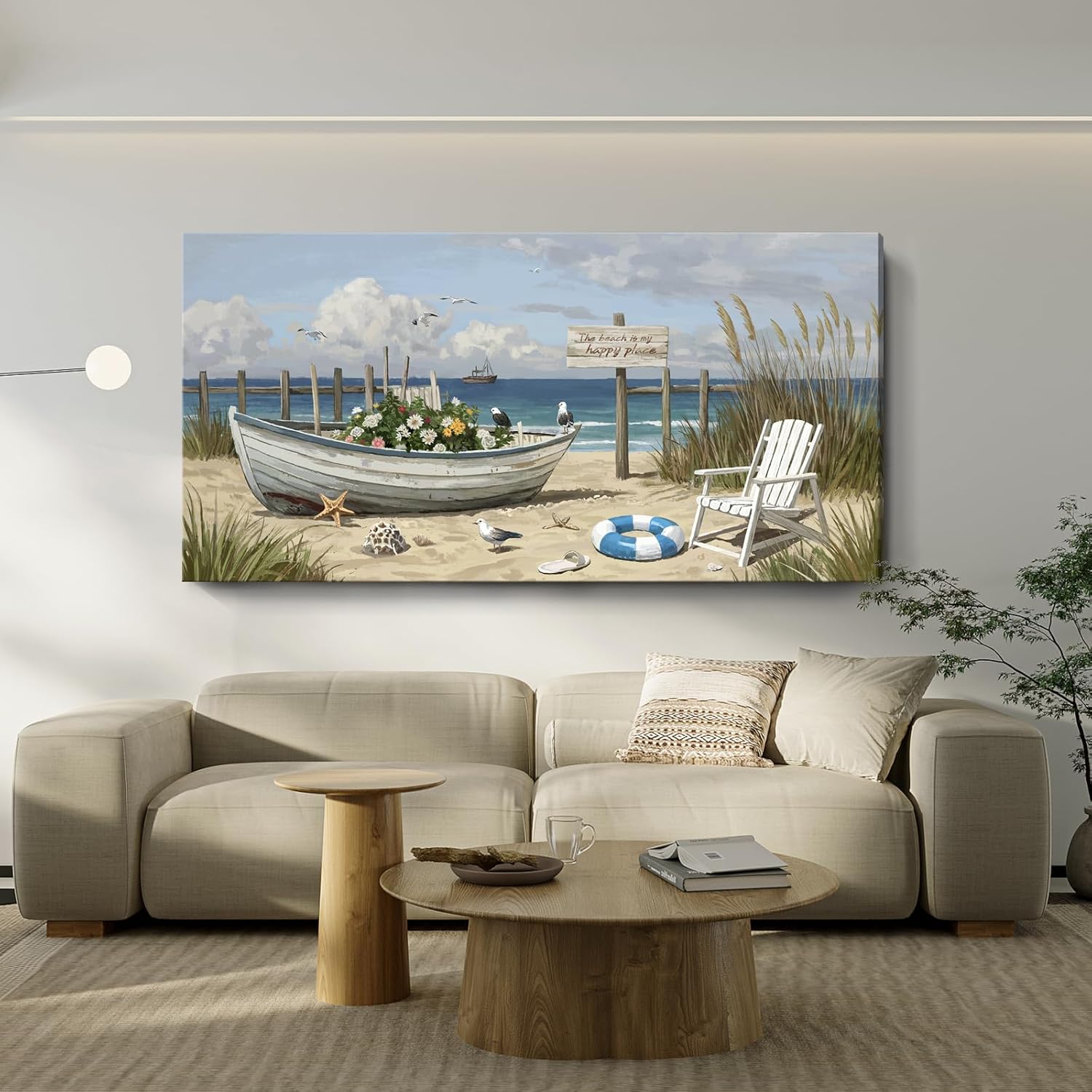 - Coastal Serenity for Your Space: Bring the calm and charm of the seaside into your home with this 58x29 inch extra-large beach wall art. A wooden flower boat rests peacefully on the sandy shore, surrounded by gentle sea breeze, soft coastal florals, and soaring seagulls. Perfect for creating a tranquil vibe in any space—be it your living room, beach-themed bedroom, or vacation home.