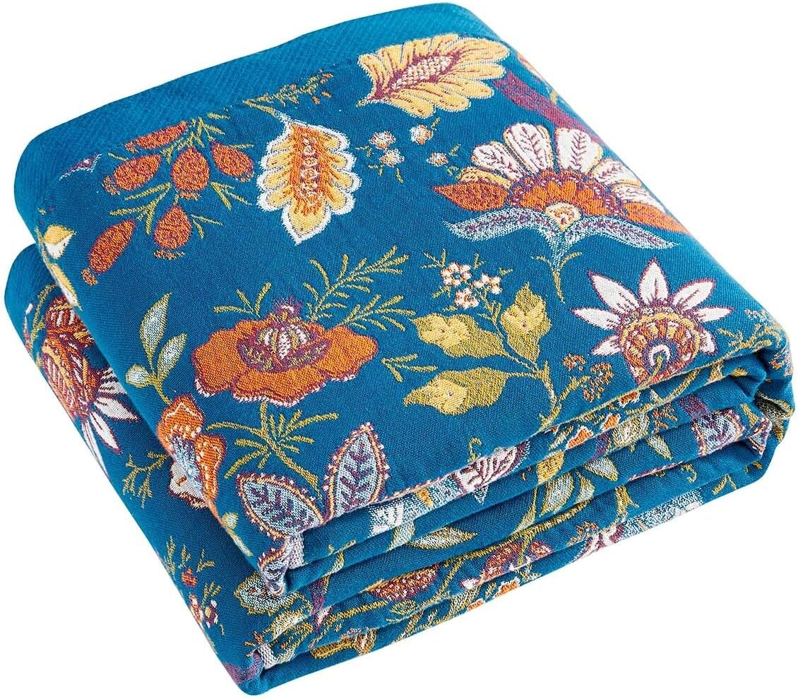 Fall Throw Blanket for Couch, Blue Boho Decorative Throw Blanket, 100% Cotton Muslin Breathable Woven Farmhouse Blankets Quilt, 60"x80" Reversible Lightweight Blankets Bohemian Throw Quilt