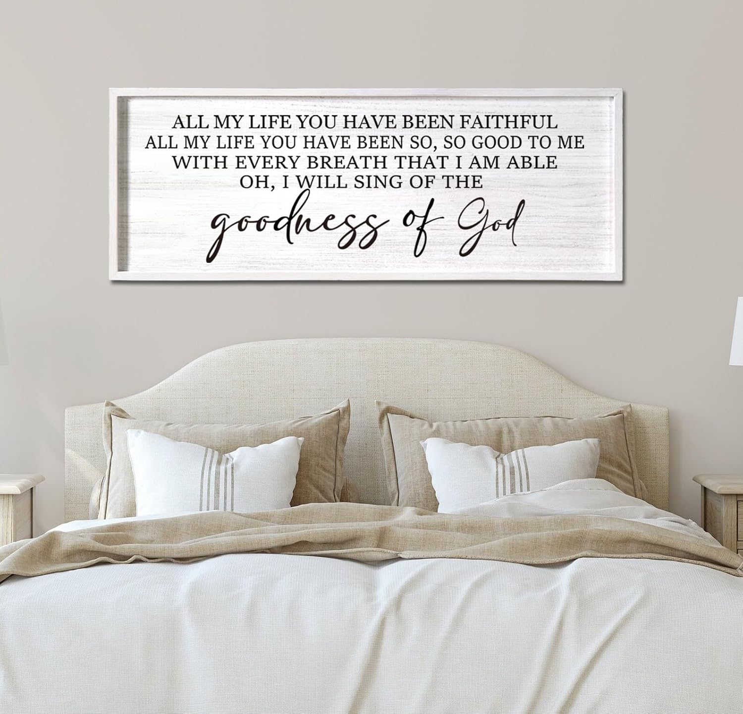 Goodness of God Framed Wall Art, 40''×15'' Positive Religious White Bible Verse for Christian God Jesus Christ Prayer, Vintage Rustic Long Holy Catholic Scripture Decor