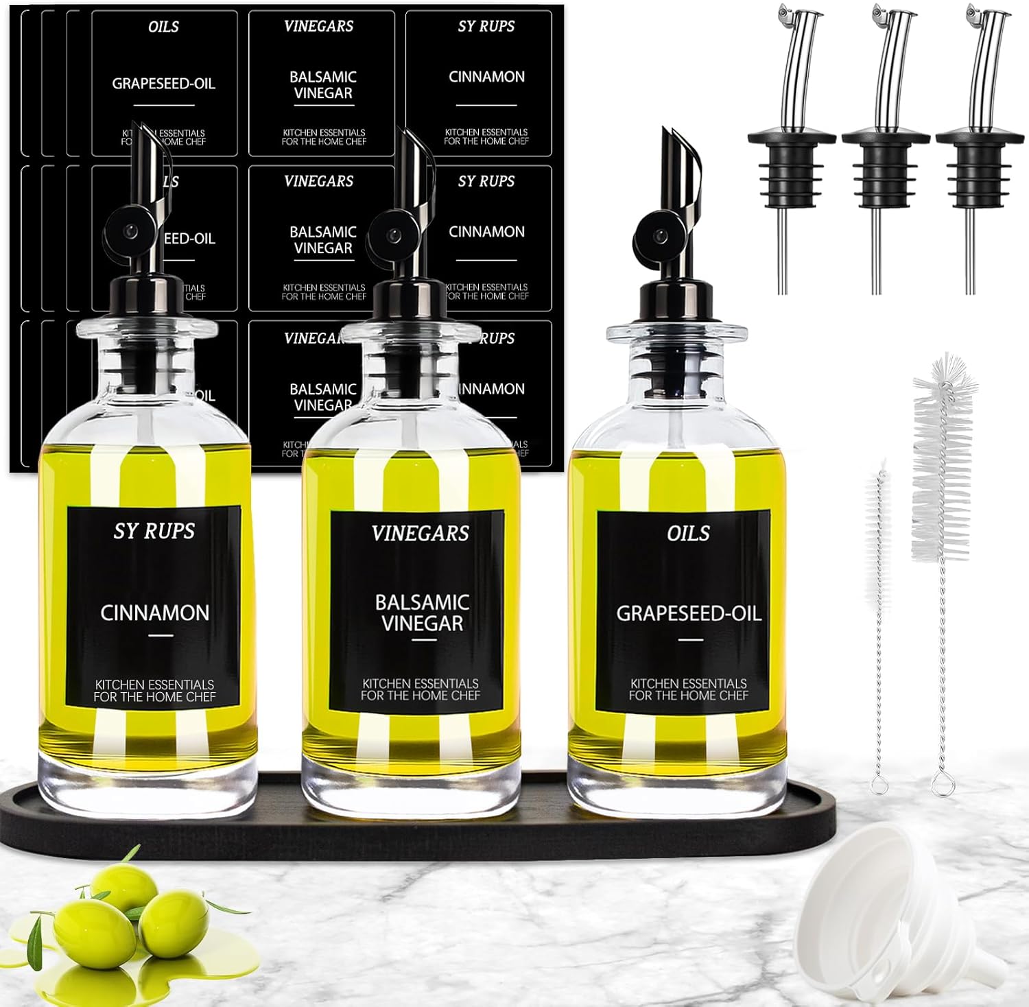 - Kitchen Oil Dispenser Set: Set of 3 premium glass olive oil dispenser bottles (perfect oil bottles for kitchen), 3 replacement spouts, a non-slip Wooden Tray, 40 labels, a funnel, and a cleaning brush – everything for organized counter tops.