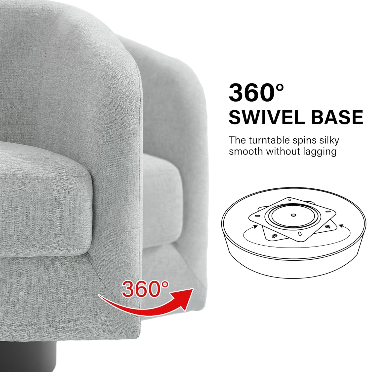 - 360 Degree Swivel Barrel Chair: This 360 degree round swivel chair designed for your leisure comfort. Heavy solid turntable, making it more stable and not wobbly
