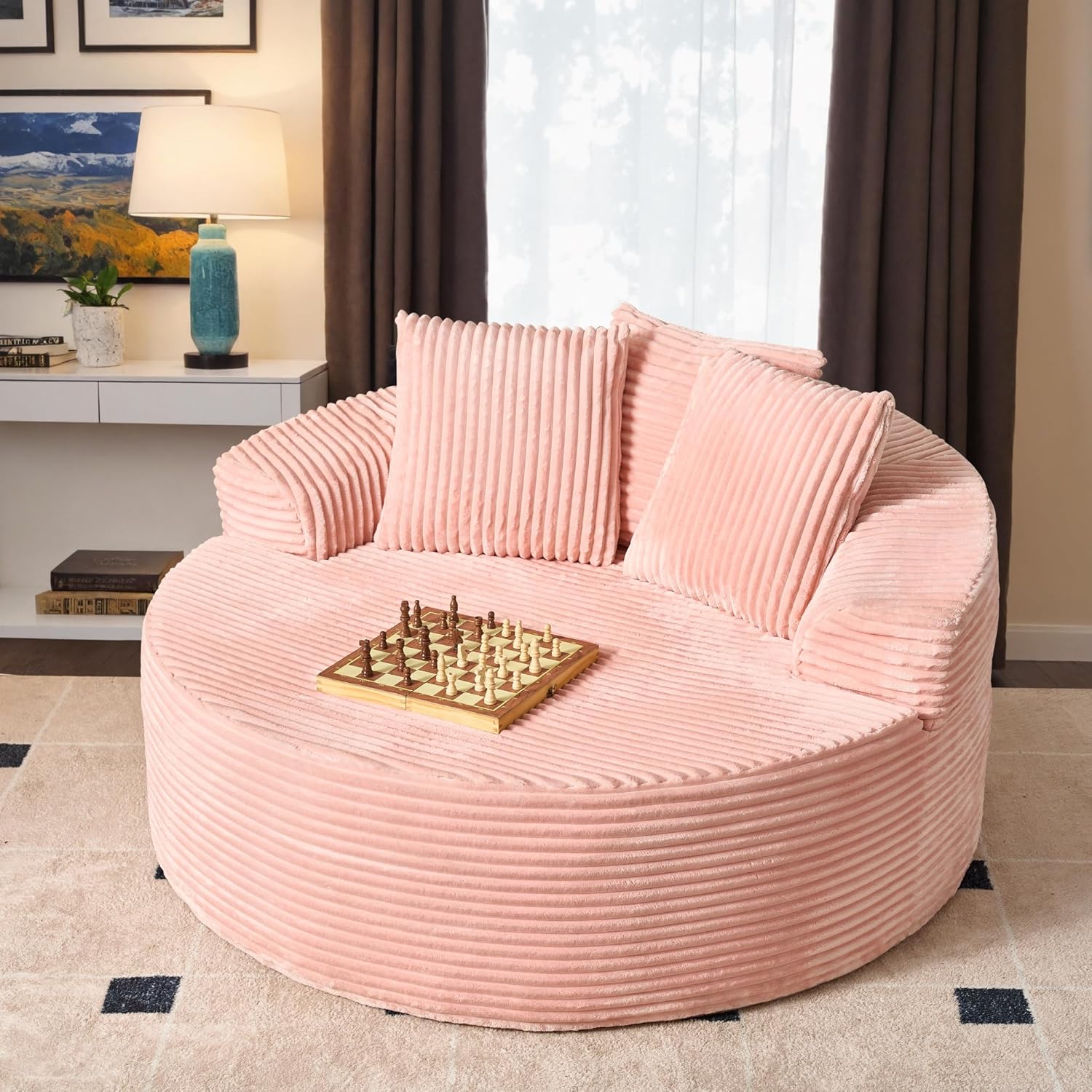 ovios 58" Oversized Round Chair Lounge Chaise Indoor, No Assembly Required, Cloud Large Circle Chair with Plush Fuax Fur, Fluffy Modern Sleeper Sofa Bed for Reading Yoga, Pink (Plush Corduroy Fabric)