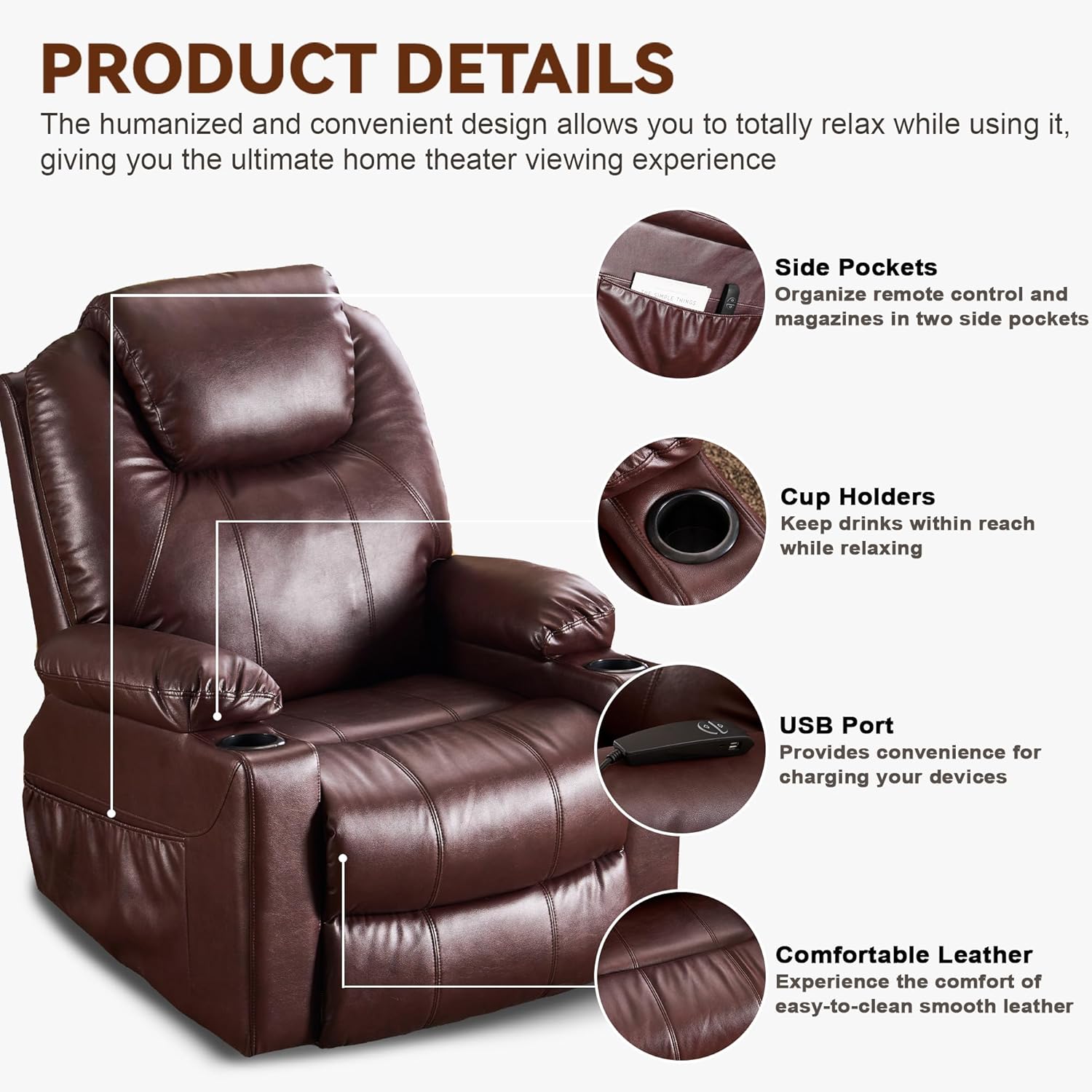- High Quality Material: The surface of the oversized recliner chair is made of PU faux leather, wear resistant, waterproof and easy to clean. The padded seat cushion is filled with high-density sponge, giving you super comfy experience. Built on a sturdy metal frame passing 12,000-time fatigue test, the heavy-duty leather recliner chair weighs 108.9 lbs, holding up to 350 lbs for long-lasting use