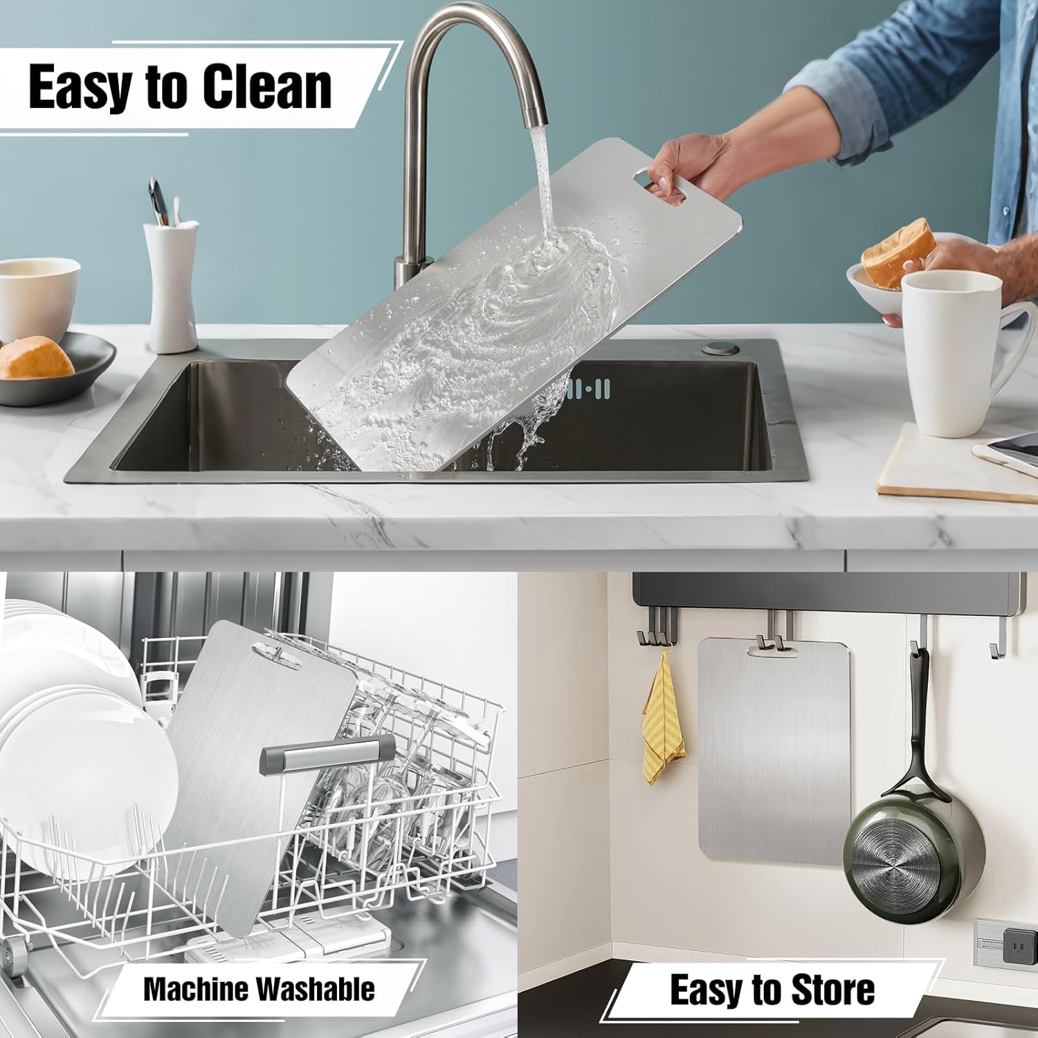 - ăEasy to Clean & StoreăThe smooth, non-porous surface of the titanium cutting board allows for easy cleaning, whether you're dealing with grease or food residue. Simply rinse with water or use the dishwasher for quick cleanup. Lightweight and can be hung, it doesnât take up much kitchen space and is easy to carry for outdoor camping or RV trips.