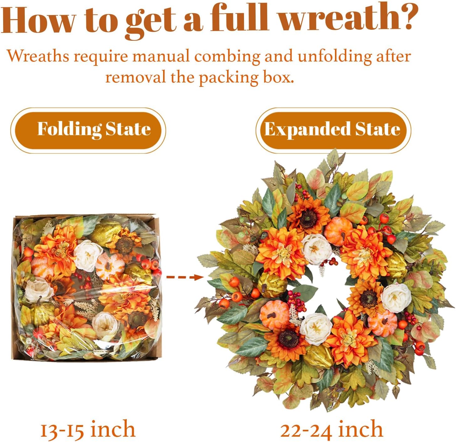 - đăFull & Balanced Design for a Natural LookăPacked with lifelike details and layered for volume, the wreathâs floral richness and fall elements create a lush, dimensional display. Its realistic dahlias, sunflowers, berries, and foliage make it a standout piece among fall wreaths for front door 24 inch collections.