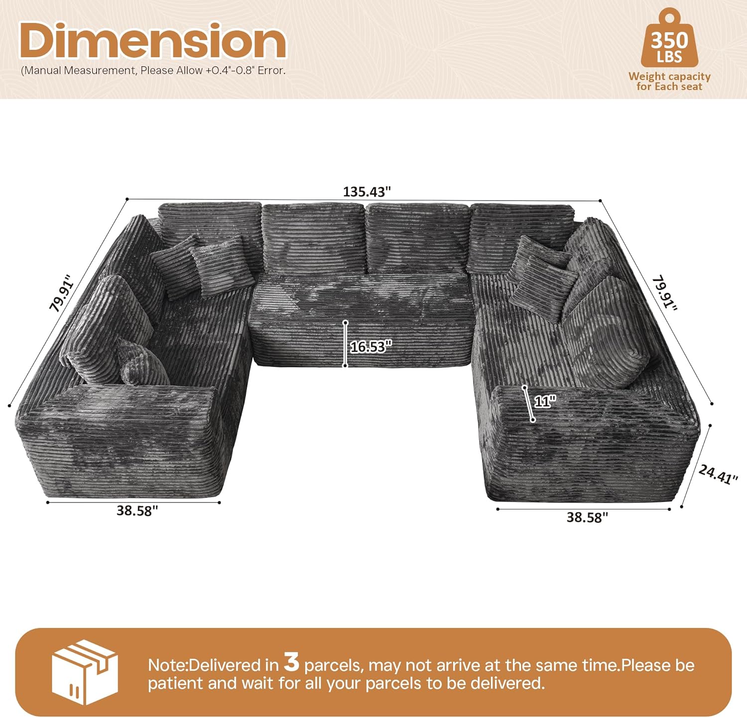 Cloud Sectional Couches for Living Room,U Shaped Modular Sofas No Assembly,135x79 Inches Plush Corduroy Oversized Floor Couch Set with Deep Seat Chaise,Grey