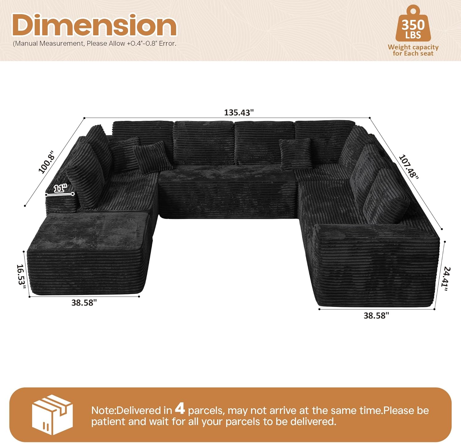 Cloud Sectional Couches for Living Room,U Shaped Modular Sofas No Assembly,135x100 Inches Plush Corduroy Oversized Floor Couch Set with Deep Seat Chaise,Black
