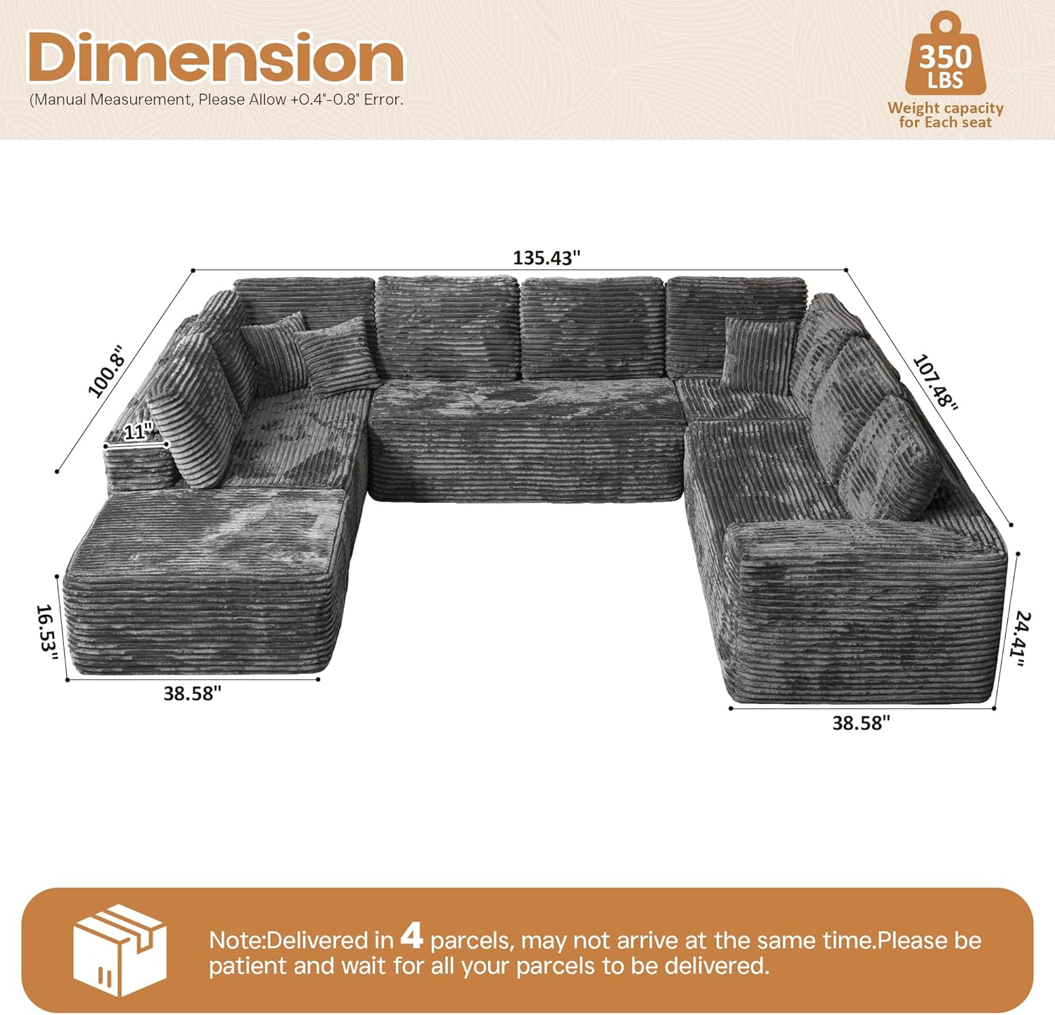 Cloud Sectional Couches for Living Room,U Shaped Modular Sofas No Assembly,135x100 Inches Plush Corduroy Oversized Floor Couch Set with Deep Seat Chaise,Grey