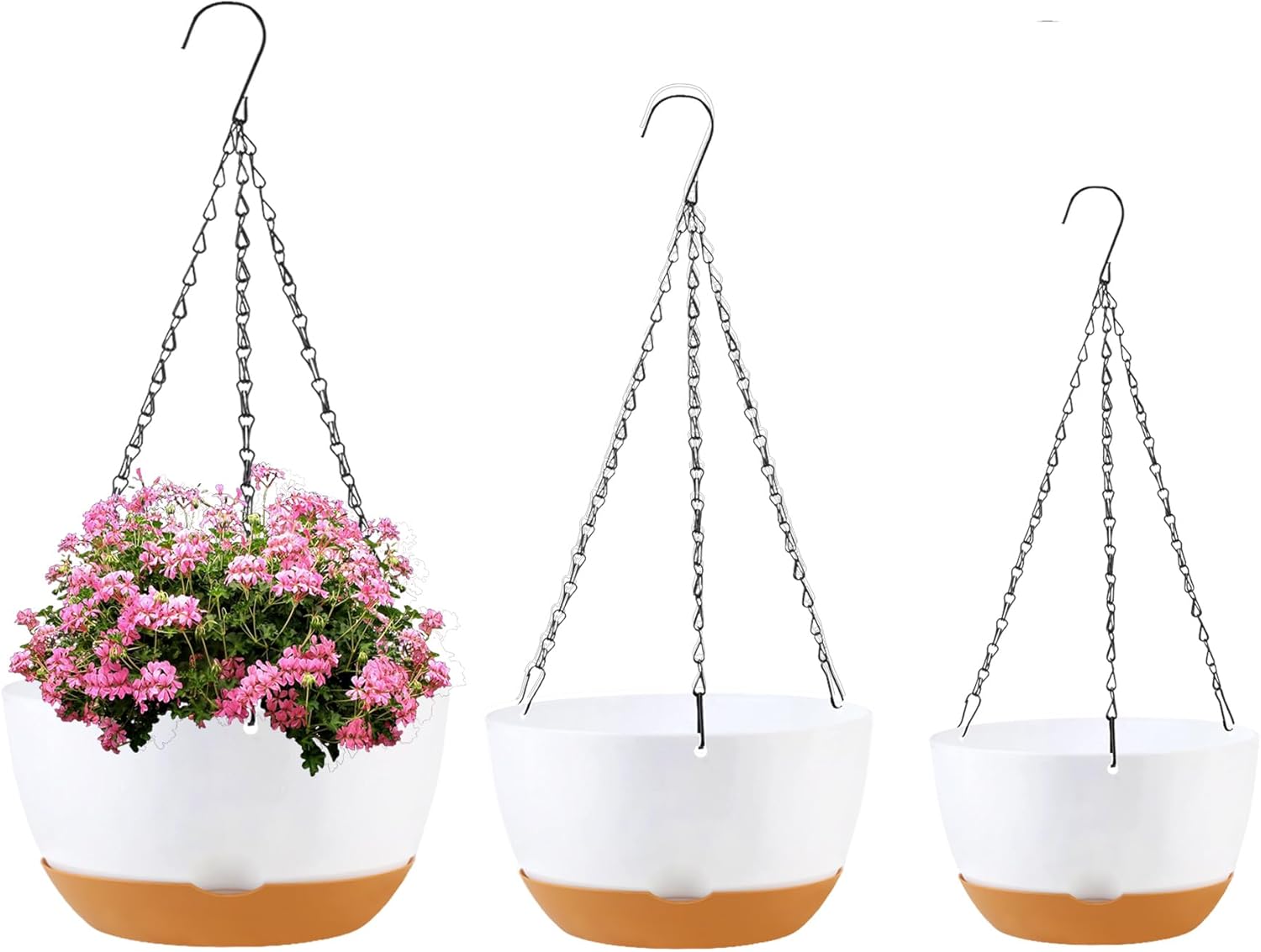 8/10/12 inch Hanging Planters for Indoor Outdoor Plants with Self-Watering Pots, 3 Pack Plastic Hanging Basket with Removable Tray for Home Garden Porch Balcony Patio Decor(White)