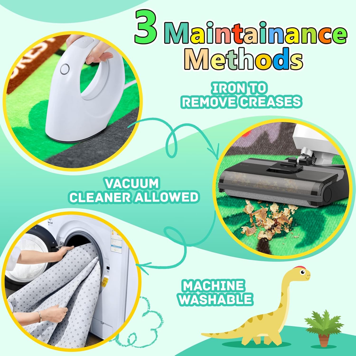 - [Unique Design]: The road rug for educational learning nursery. The car carpet series features vibrant landscapes of dinosaur life, including T-Rex, Pterodactyl, Velociraptor, Stegosaurus, Triceratops, and Brachiosaurus. Your child could use all of their toys for hours of exploration on the dinosaur play rug.