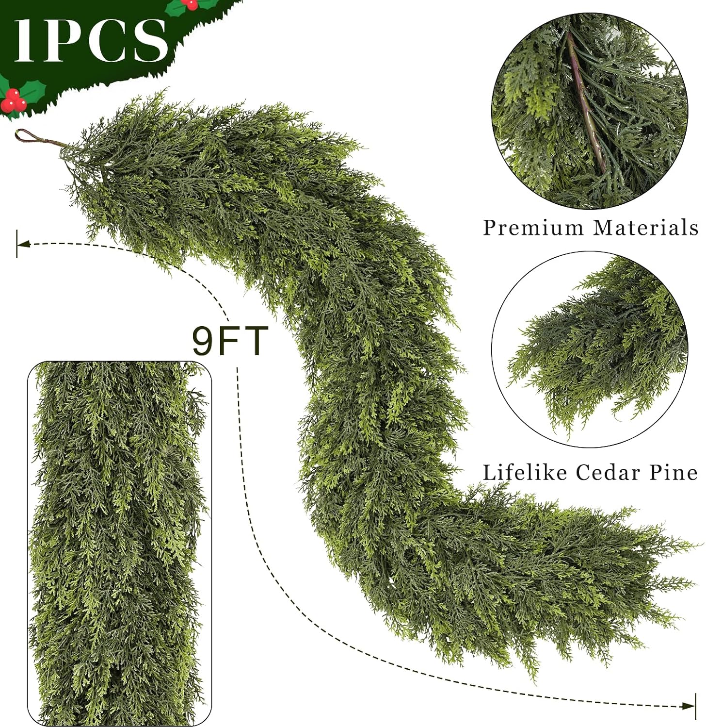 9FT Real Touch Cedar Garland for Fireplace - Artificial Christmas Garlands Realistic Faux Greenery Fake Pine Needles Garland for Holiday,Table, Window,Mantel,Stairs, Home,Indoor Outdoor Decor (1PCS)